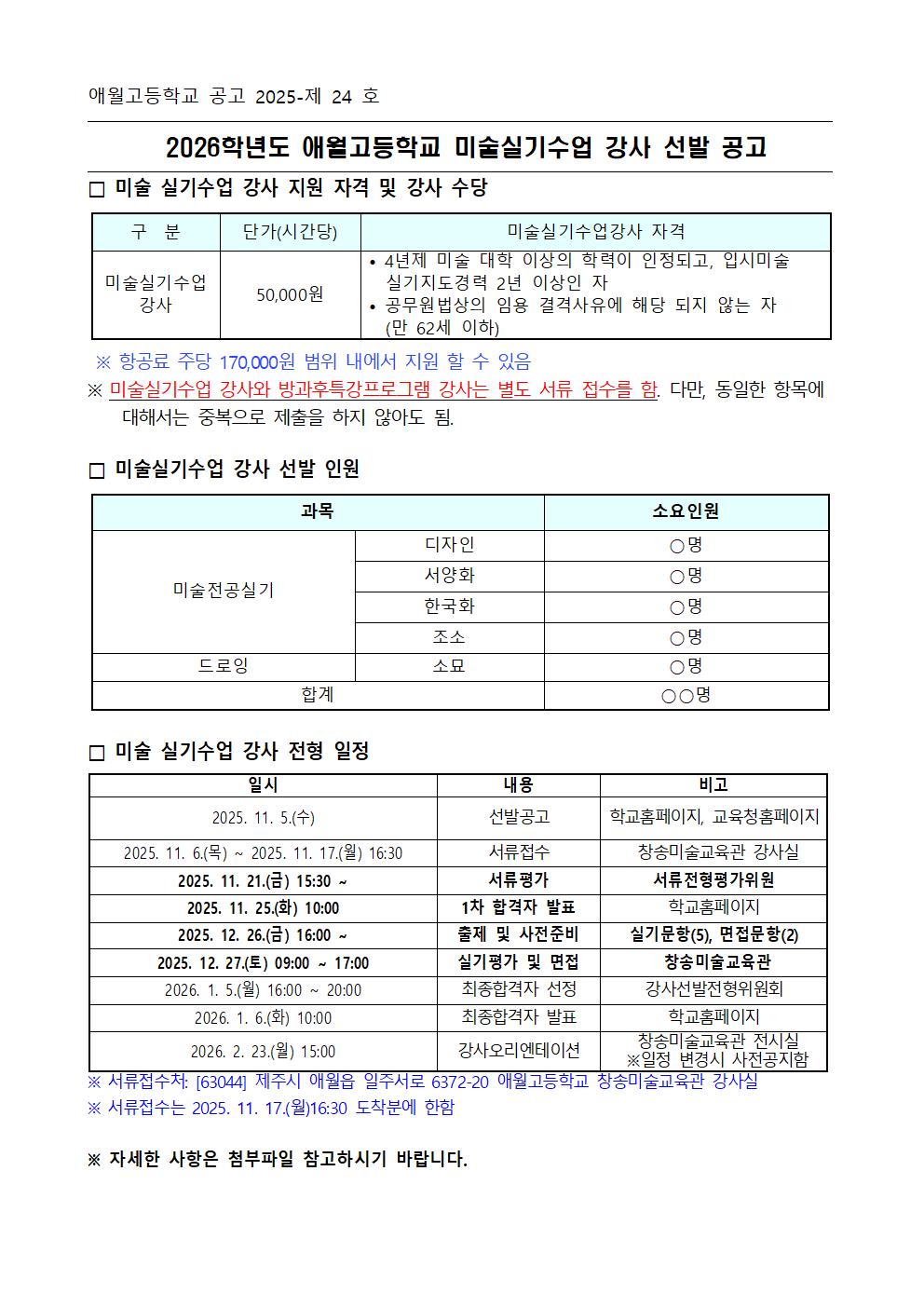2026학년도 애월고등학교 미술실기수업 강사 선발 공고