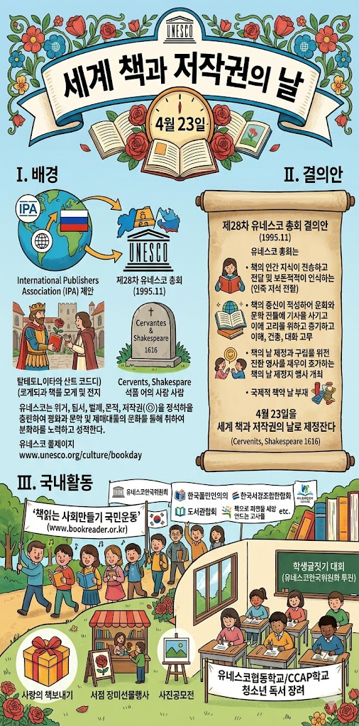 2026년 4월 23일은 세계 책과 저작권의 날입니다. 오늘 하루 만큼은 독서에 대한 마음가짐을 다시금 돌아보고, 저작물에 대한 올바른 사용에 대하여 돌아보는 하루가 되었으면 합니다.