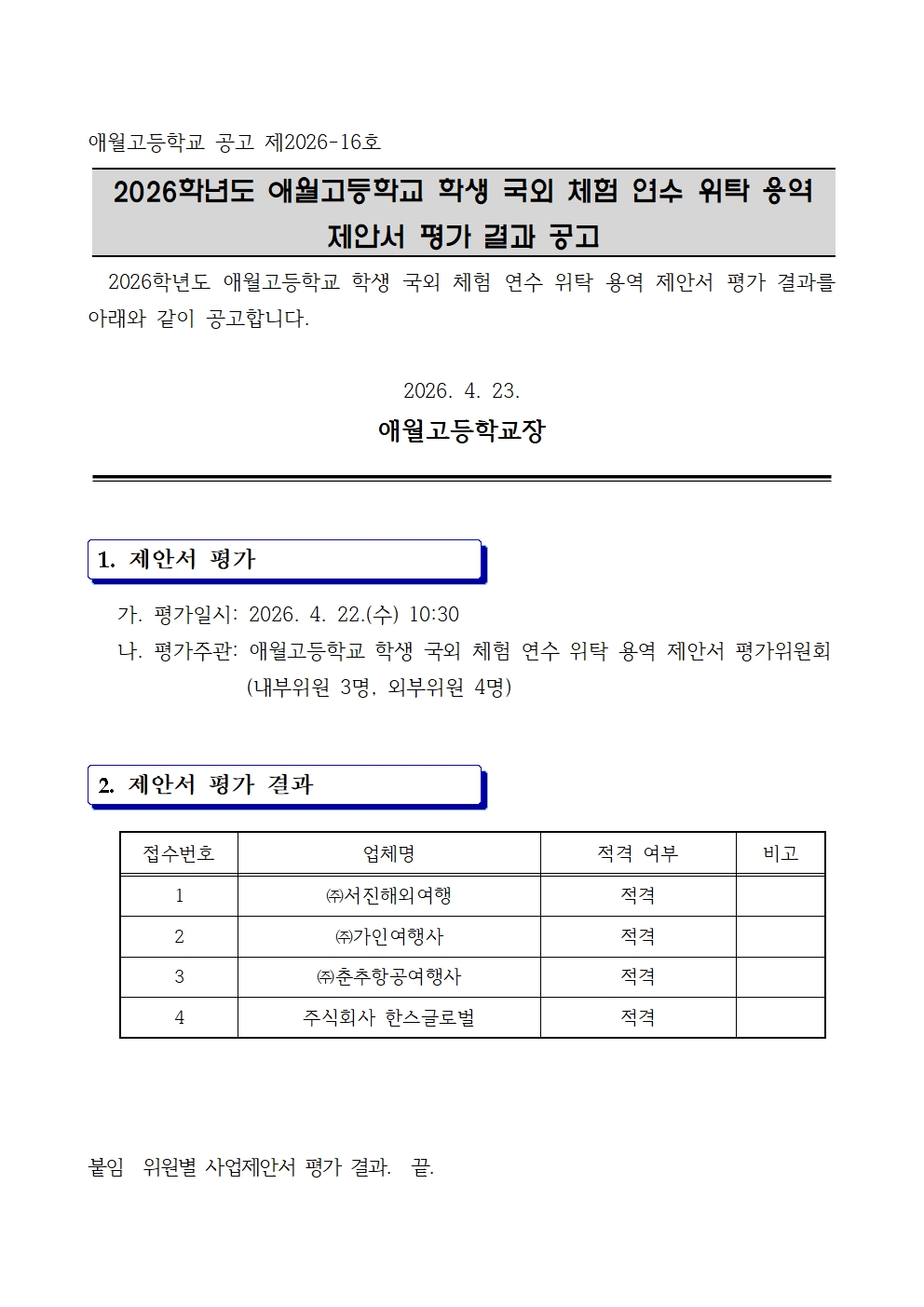 2026학년도 애월고등학교 학생 국외 체험 연수 위탁 용역 적격업체 선정 공고 및 평가결과 공개