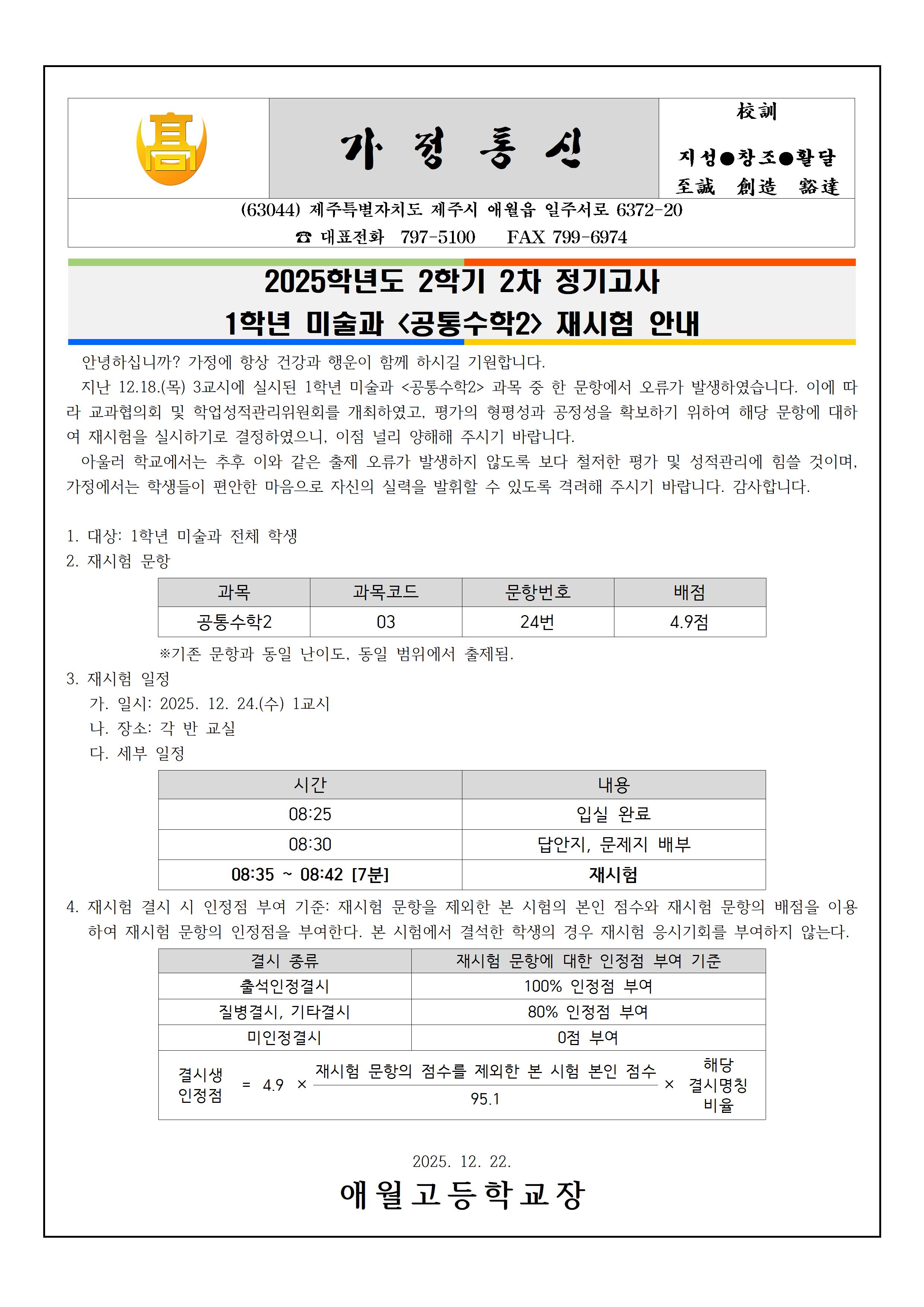2025학년도 2학기 2차 정기고사 1학년 미술과 공통수학2 재시험 안내 가정통신문.pdf