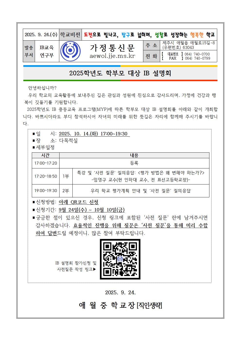 2025학년도 학부모 대상 IB 설명회 가정통신문