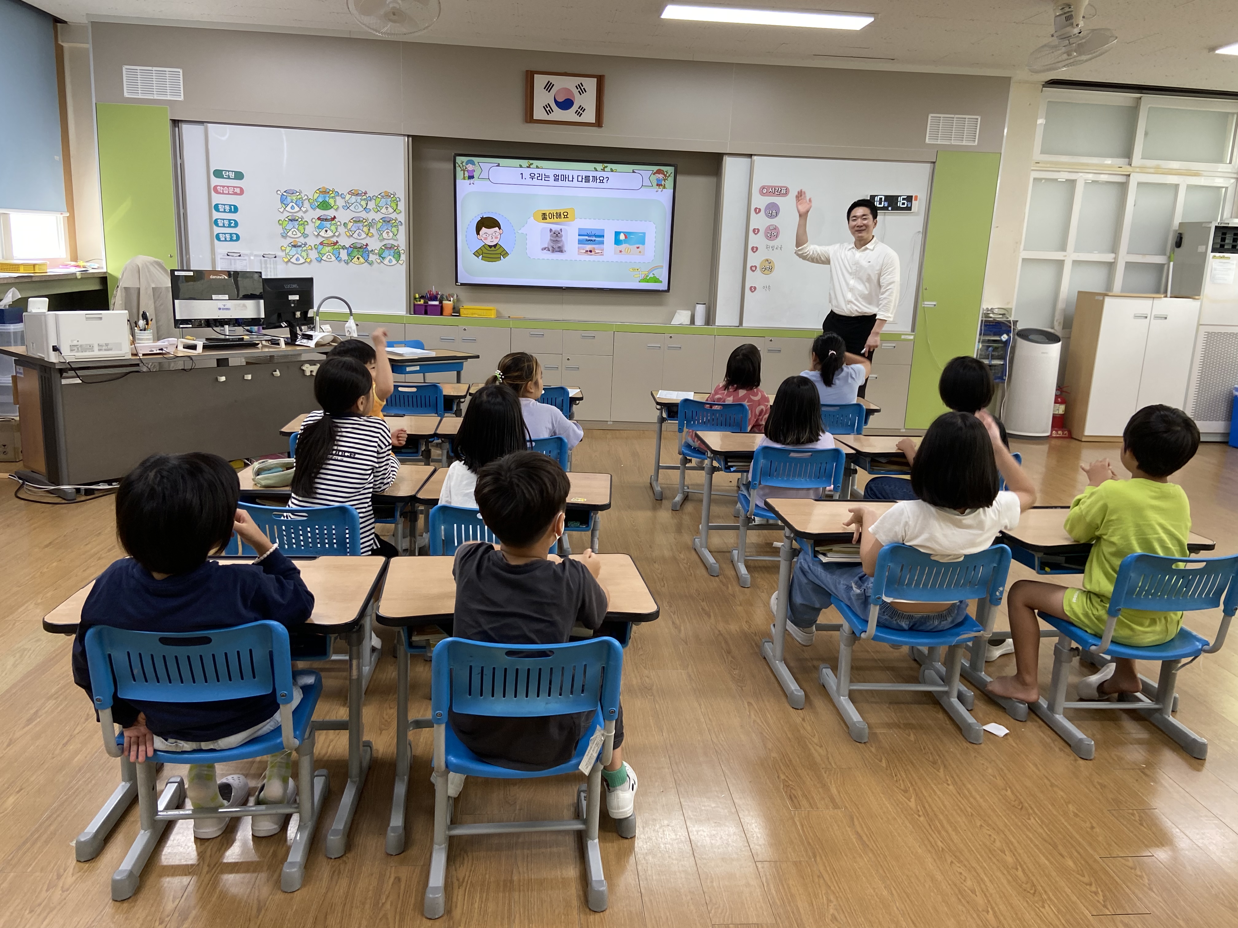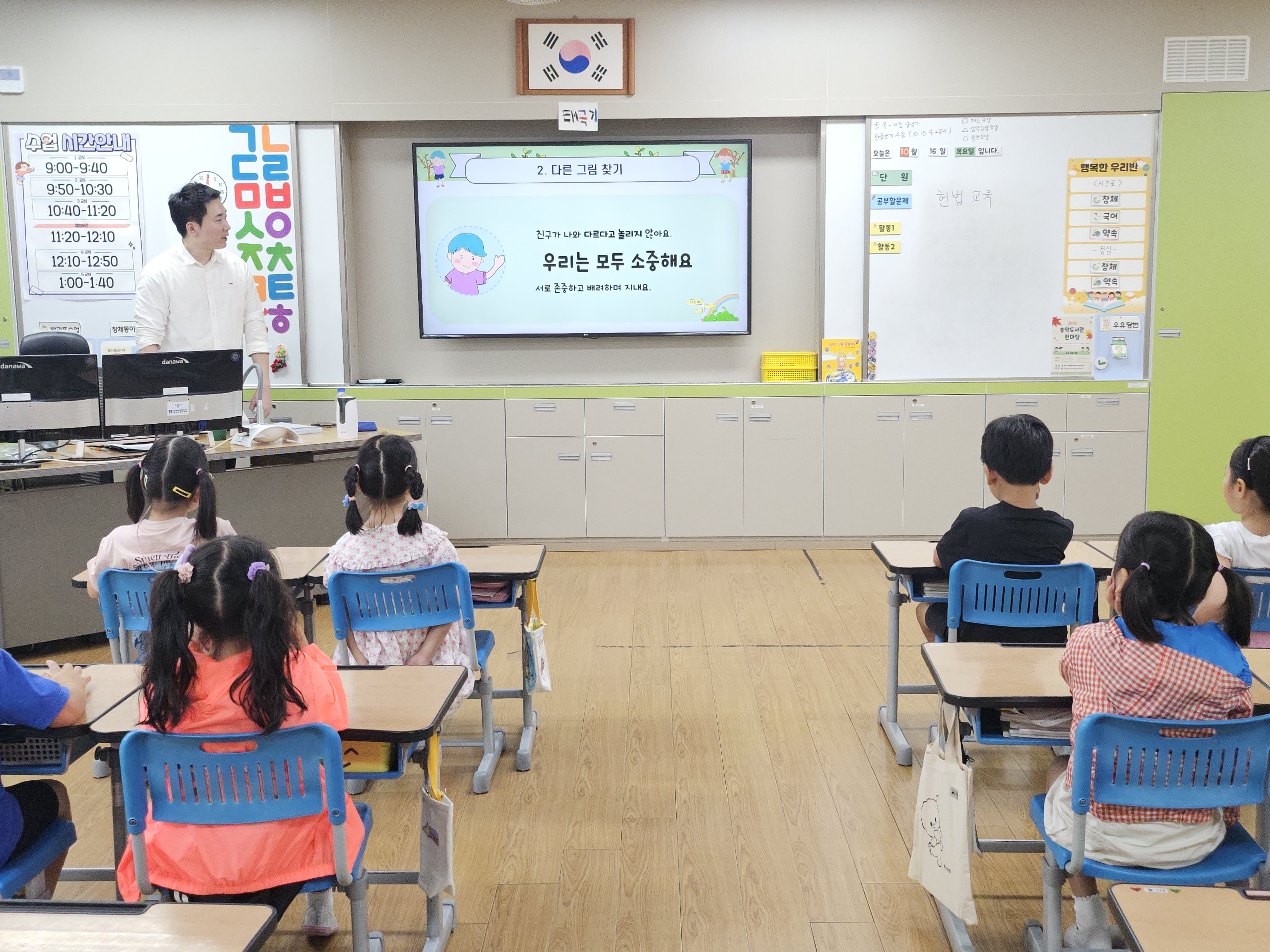 □ 1학년 학생들에게는 '인권이란 무엇일까?'라는 질문을 시작으로 모든 사람은 소중하고 존중받을 권리가 있다는 내용을 중심으로 수업이 진행되었다. 다른 그림 찾기, 인권 그림일기 쓰기를 통해 인권의 의미를 쉽게 이해하고 친구를 대할 때 지켜야 할 예절과 마음가짐에 대해 이야기 나누었다. 또한 '서로 다르지만 모두 소중해요'라는 주제로 친구의 생각과 감정을 존중하는 활동을 하며 일상 속에서 인권을 실천하는 방법을 배웠다.