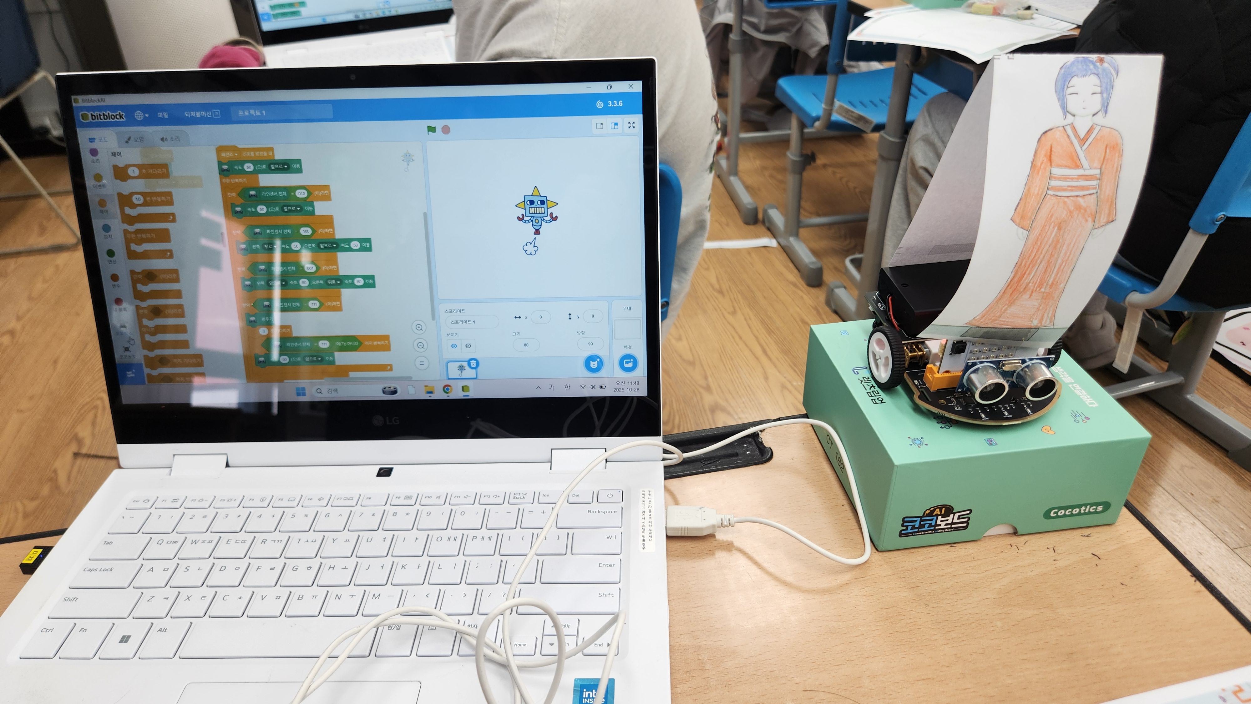 □ 각 학급별 총 4회에 걸쳐 '컬처로드! 코드로 연결하는세계' 프로그램 수업을 진행하였다. 코코보드 교구를 활용하여 LED, 버튼, 인공지능 이미지, 적외선 센서 등의 학습 요소에 대한 활동이 이루어졌다.