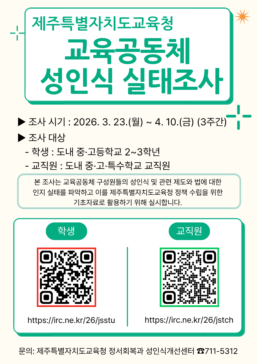 2,3학년 및 교직원 교육공동체 성인식 실태조사 안내[제주특별자치도교육청]