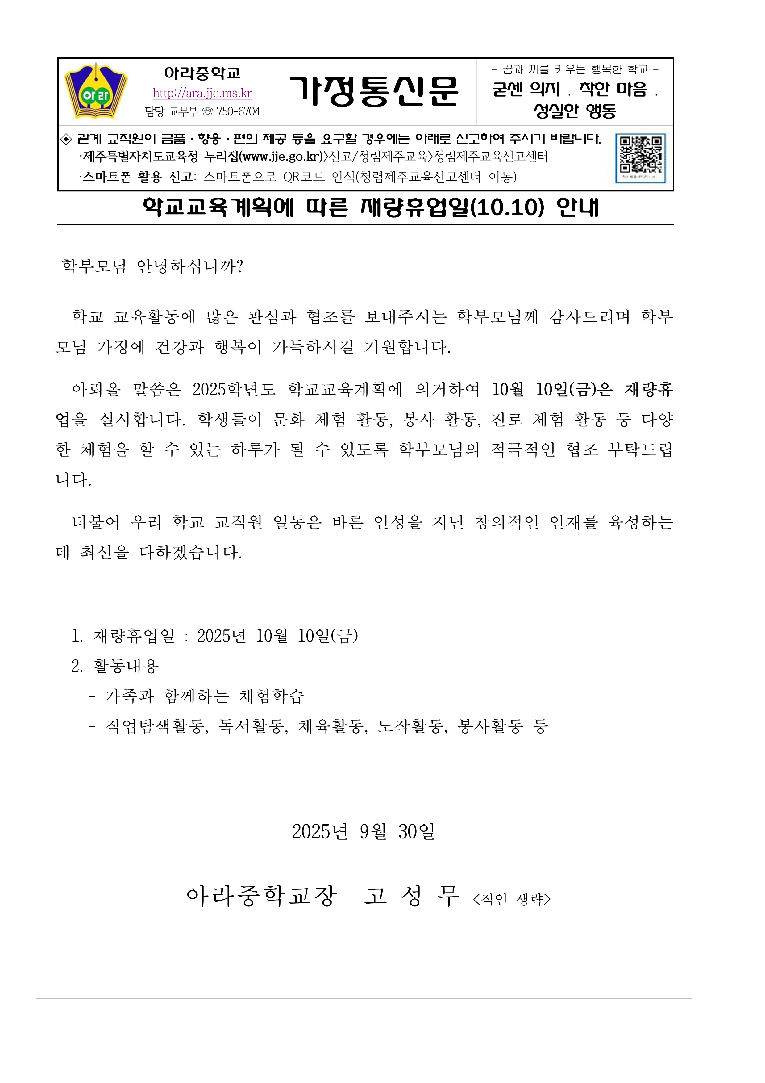 학교교육계획에 따른 재량휴업일 안내(10.10.)
