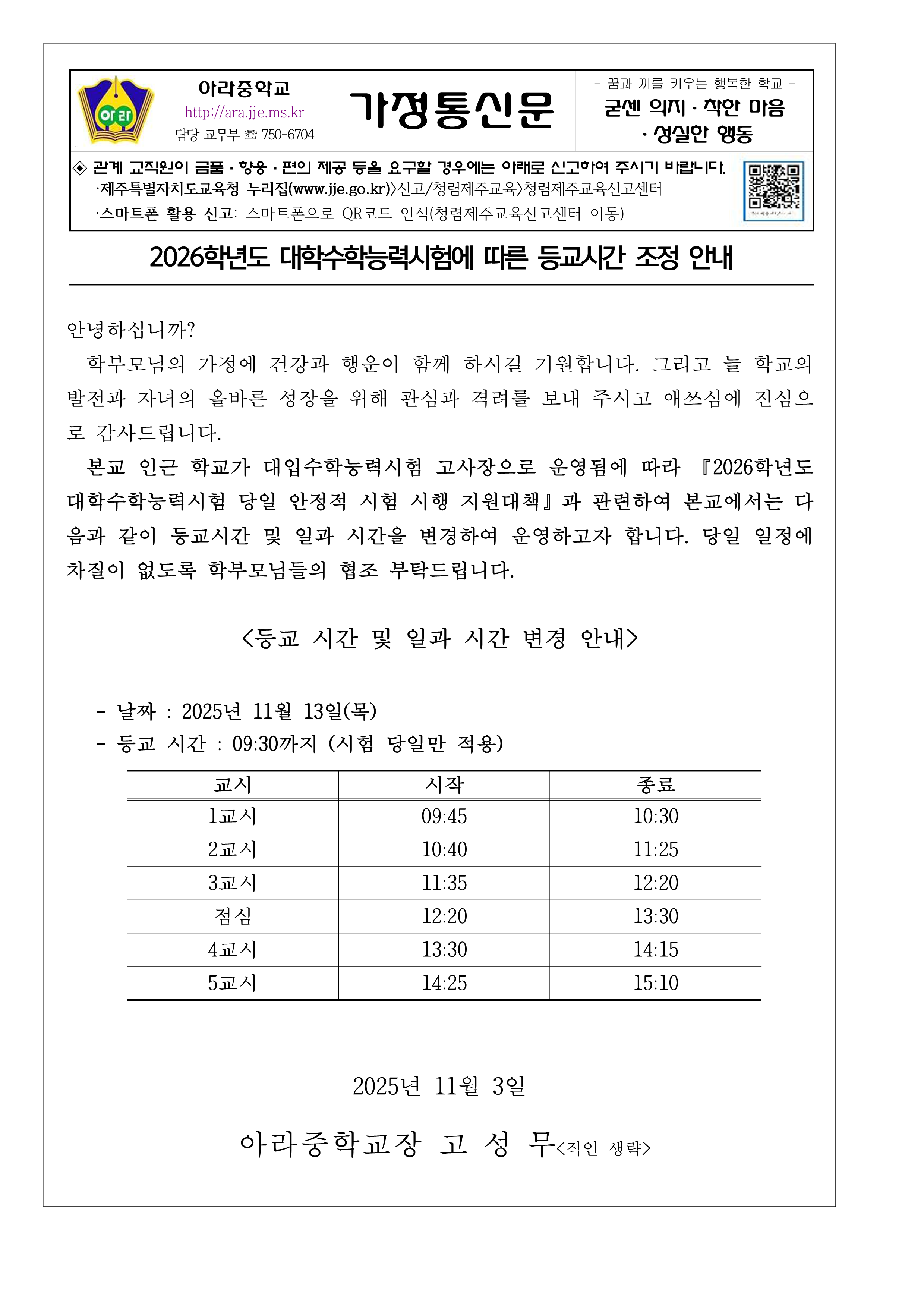 2026학년도 대학수학능력시험에 따른 등교시간 조정 안내