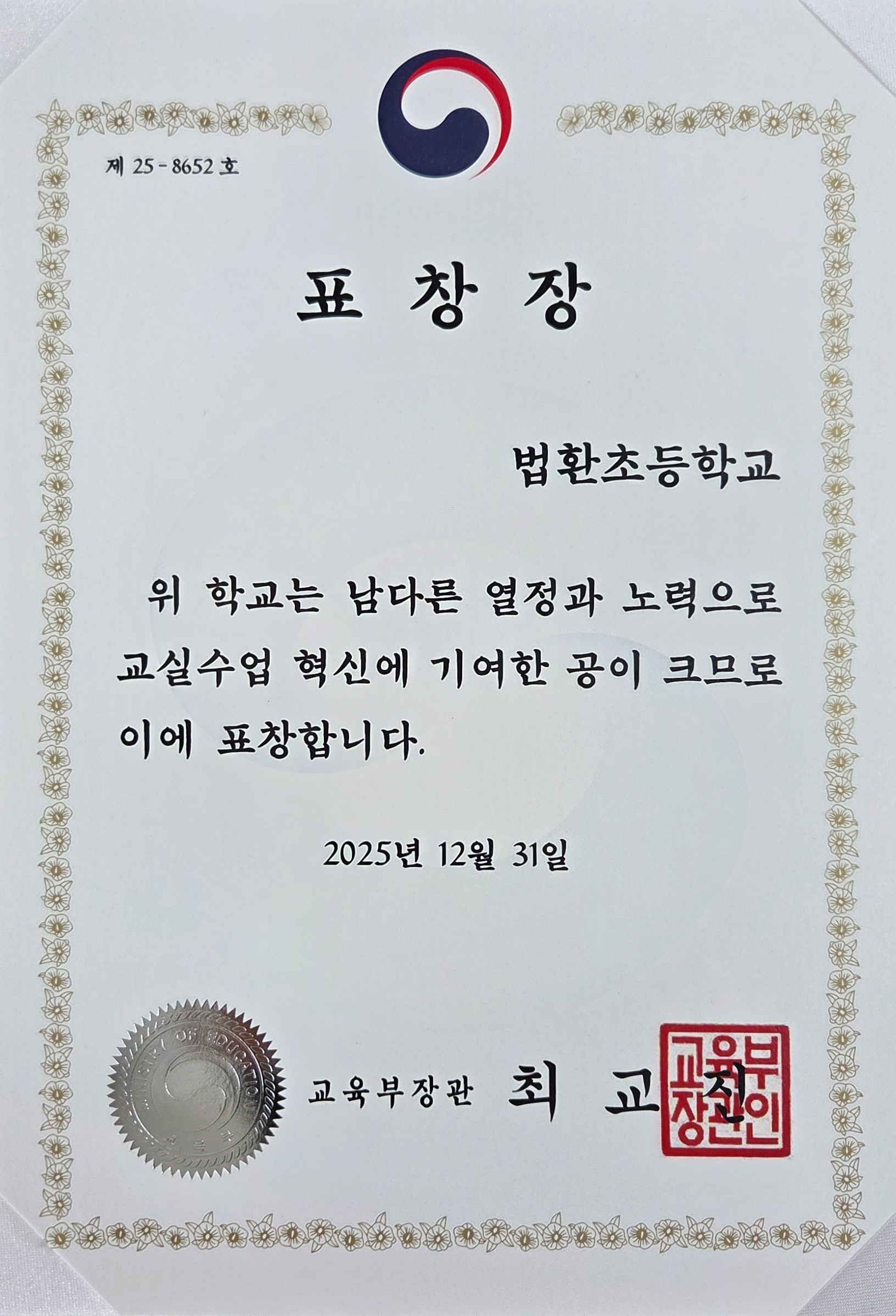 법환초등학교는 3개년간 디지털 기반 교수학습 혁신을 이루고, 기초학력 보장과 학생 미래역량 함양 및 미래학교 모델 정착에 기여한 공로로 교실수업수업 혁신 우수학교 교육부장관 표창을 수상하였습니다.