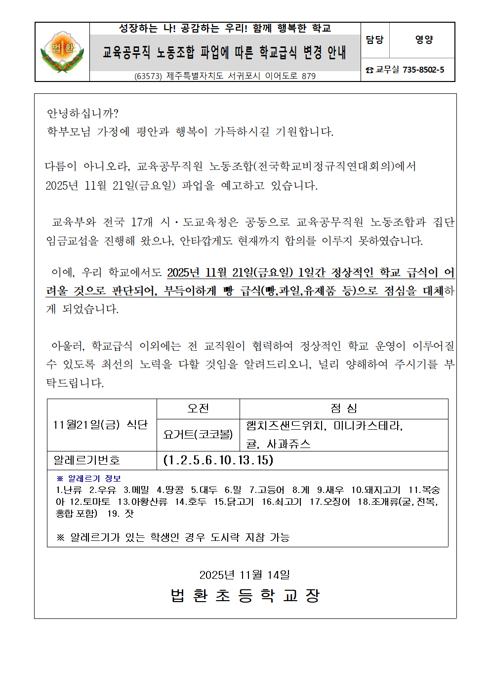 교육공무직 노동조합 파업에 따른 학교급식 변경 안내