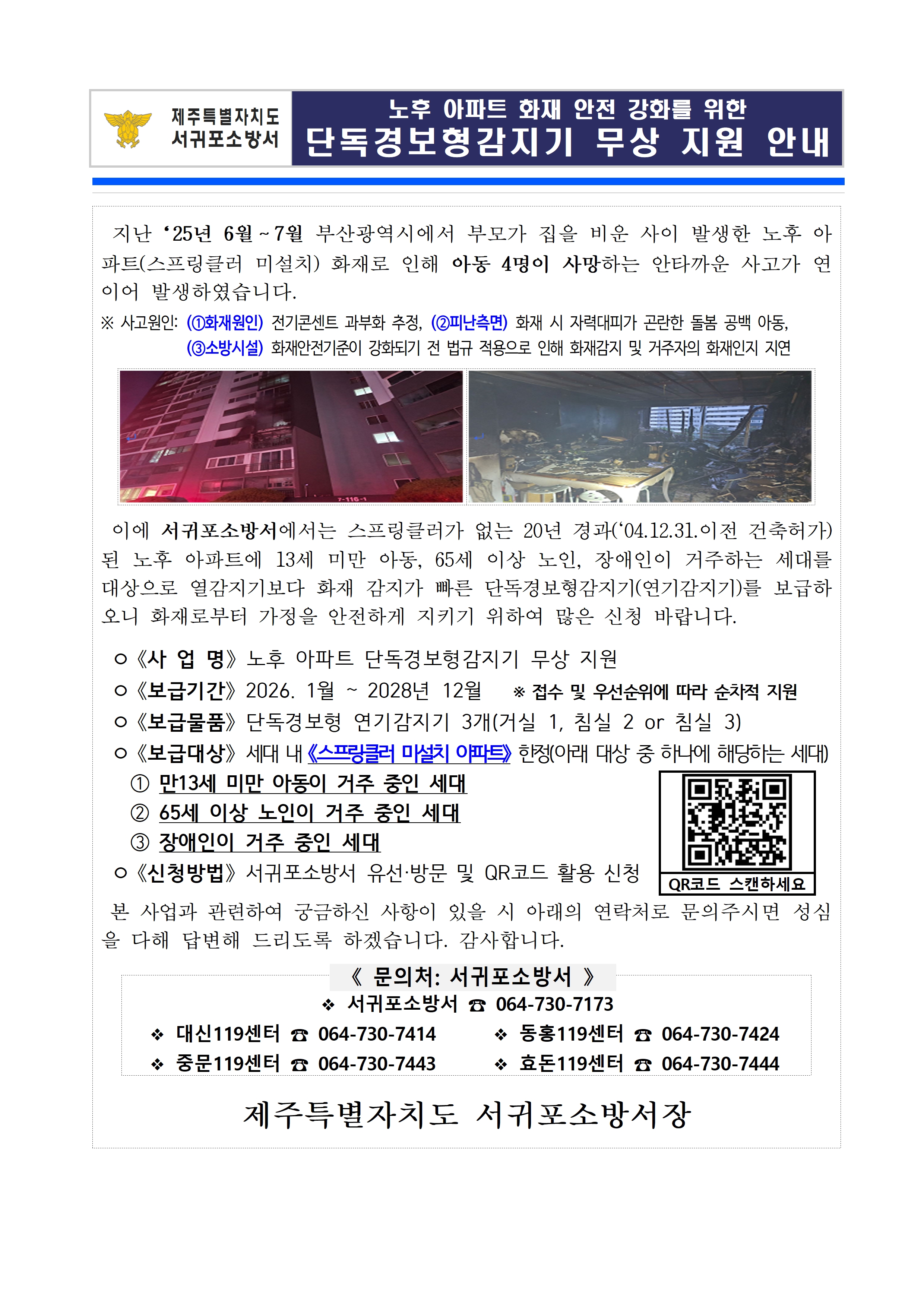 노후 아파트 화재 안전 강화를 위한 단독경보형감지기 무상 지원 안내