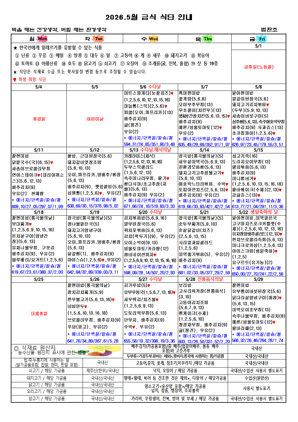 2026학년 5월 월간식단 안내