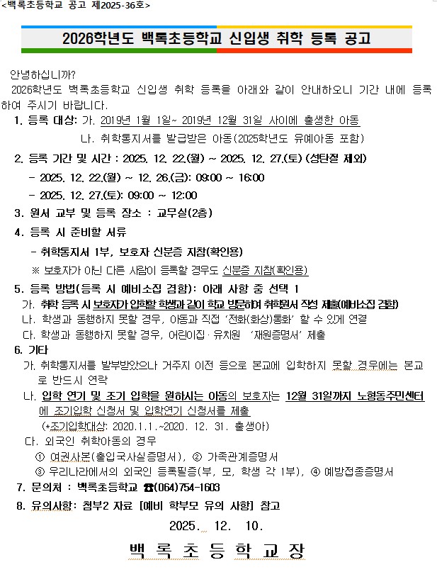 2026학년도 백록초등학교 신입생 취학 등록 공고