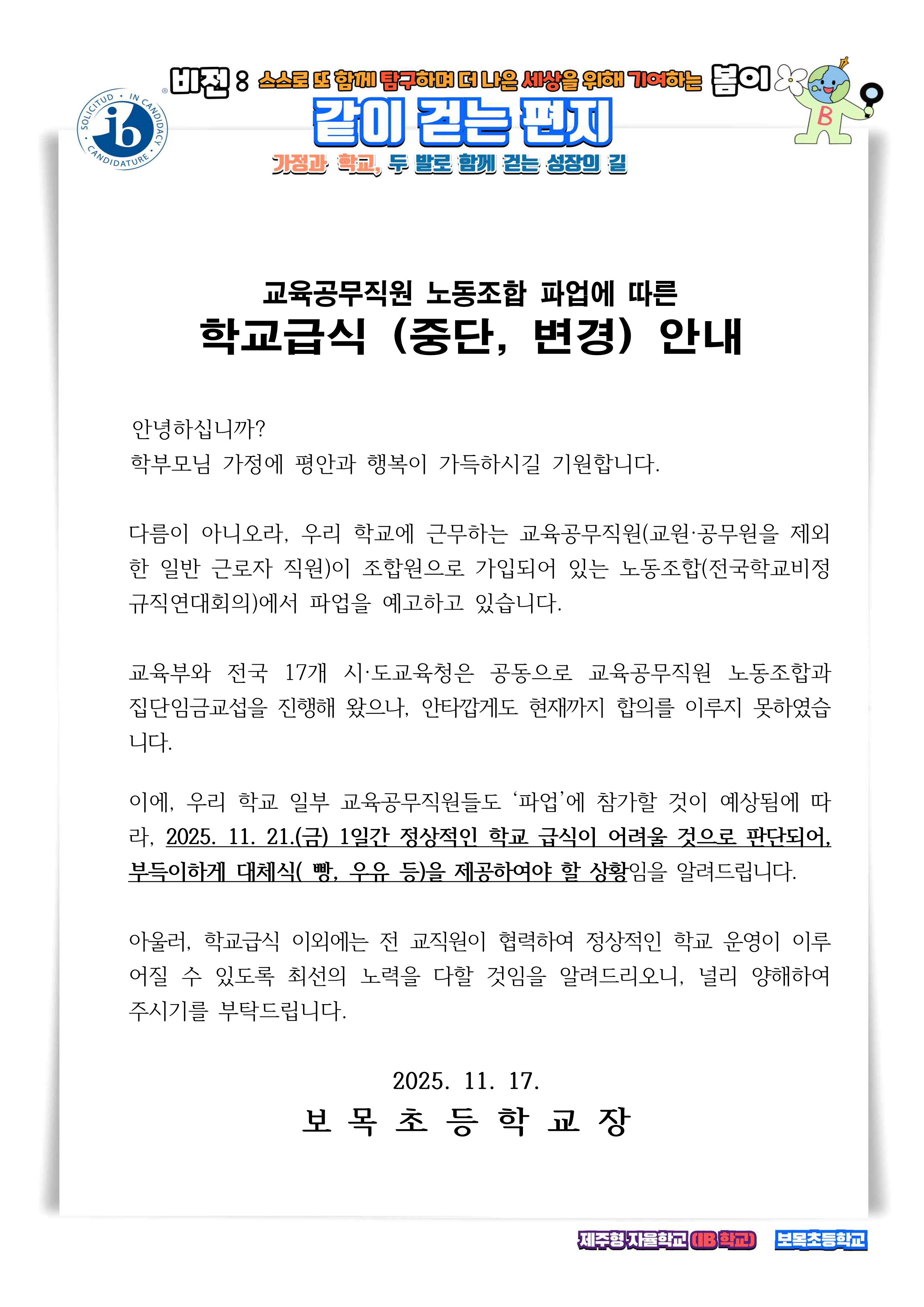 교육공무직원 노동조합 파업에 따른 학교급식 변경 안내