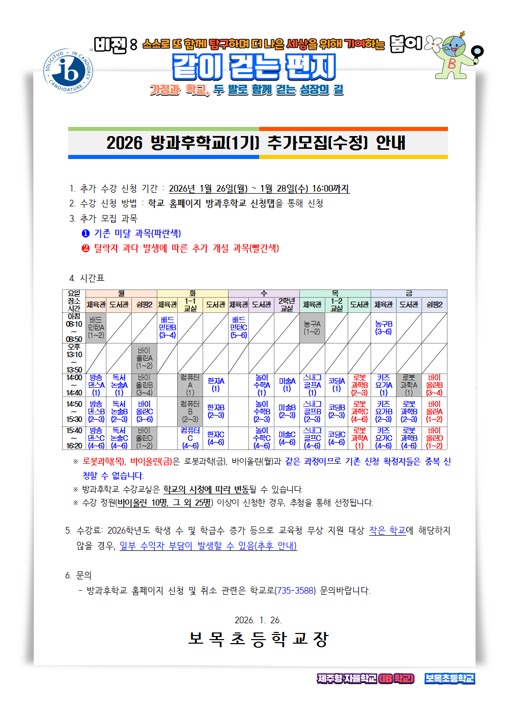 <보목초 방과후학교 추가모집 수정 사항 안내>화요일과 수요일에 운영 예정이었던 원어민 무료 영어 프로그램은 학교 사정으로 인해 진행이 어렵게 되었음을 안내드립니다.해당 프로그램을 제외한 기타 방과후학교 추가모집 강좌는 기존 계획대로 모집을 진행하고 있습니다.혼란을 드리게 되어 진심으로 사과드리며, 학부모님들의 양해를 부탁드립니다.감사합니다.