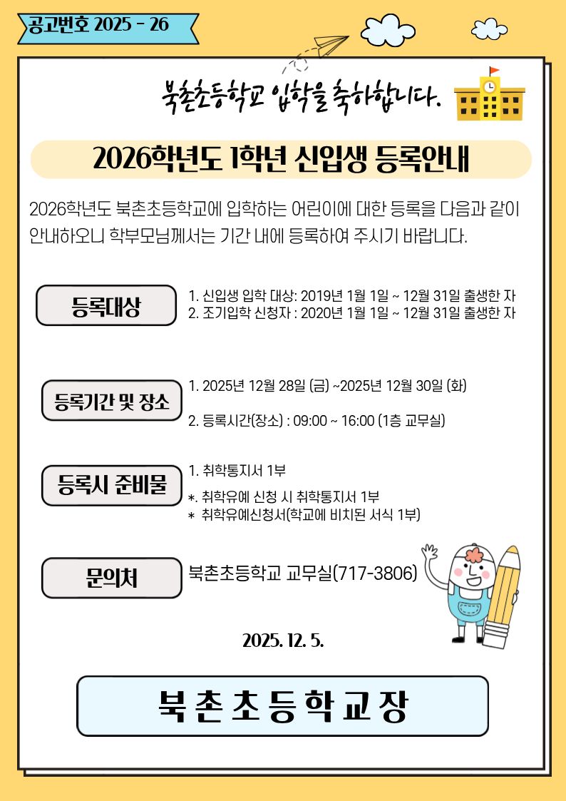 2026학년도 북촌초등학교 취학아동 등록 안내