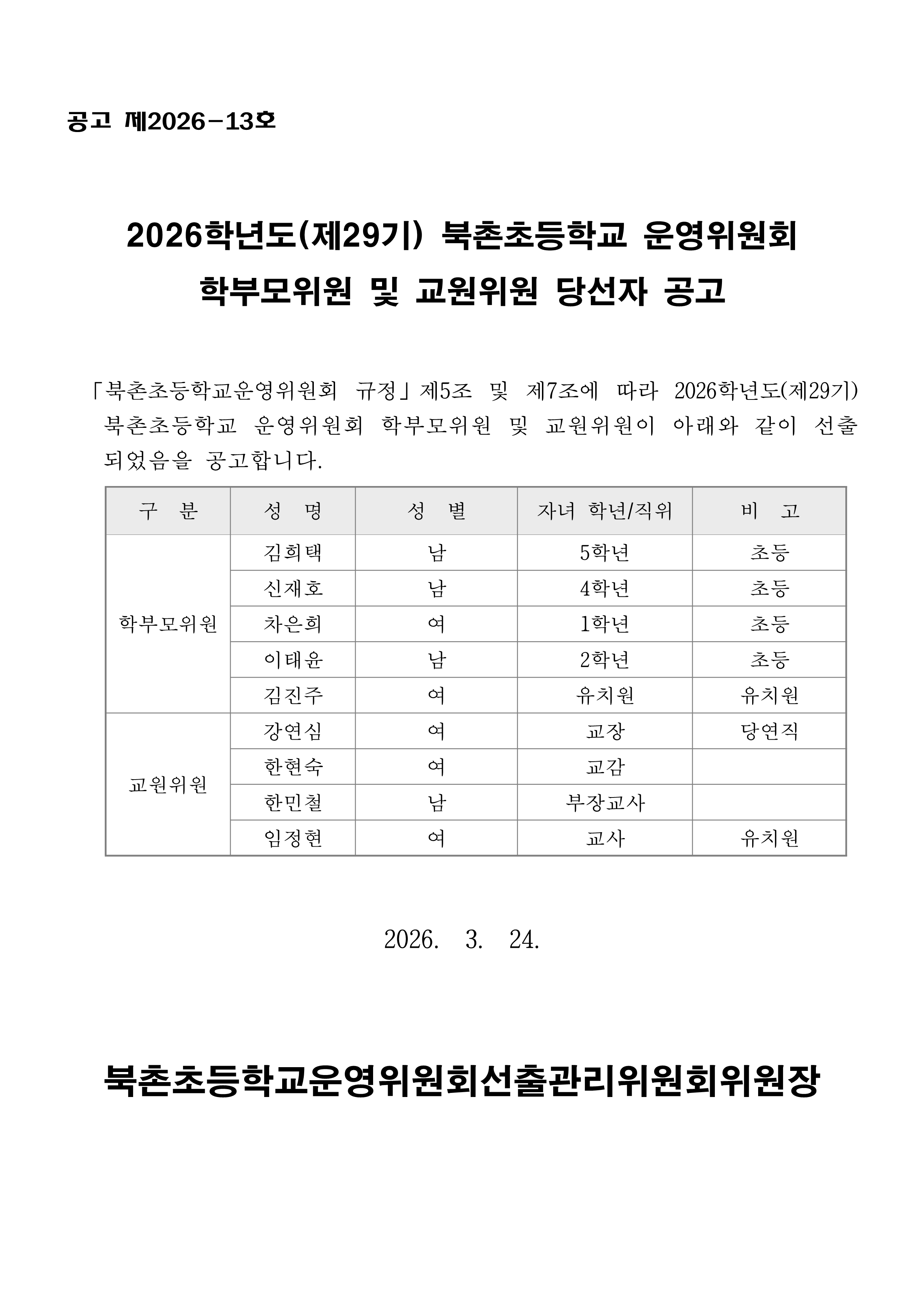 2026학년도(제29기) 운영위원회 학부모위원 및 교원위원 당선자 공고