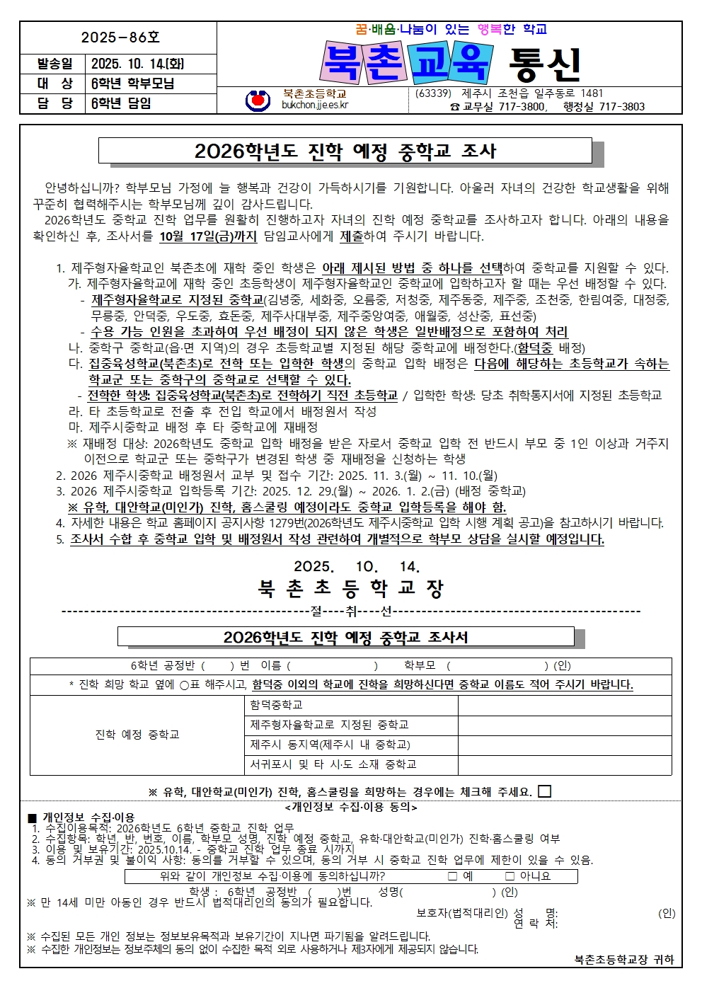 [2025-86호] 2026학년도 진학 예정 중학교 조사