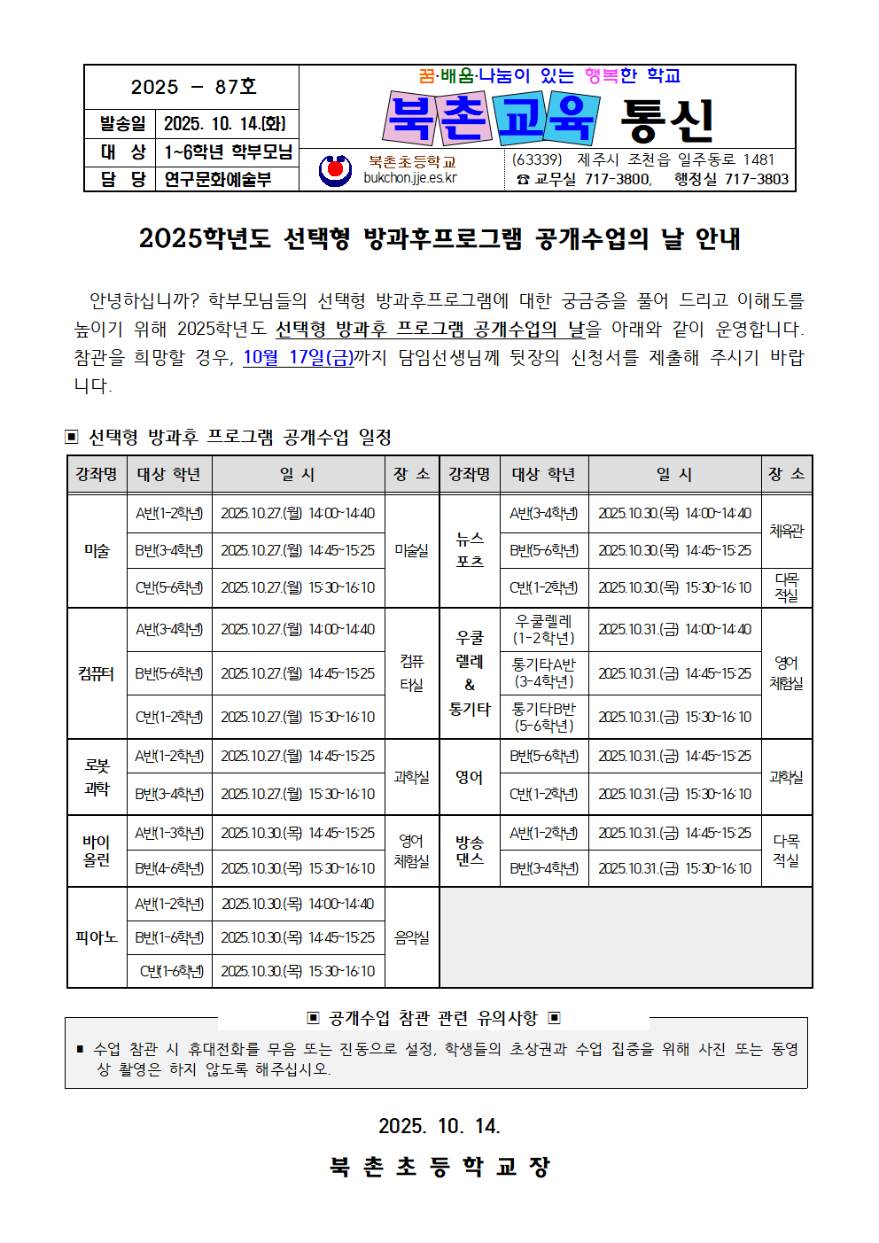 [2025-87호] 2025학년도 선택형 방과후프로그램 공개수업의 날 안내