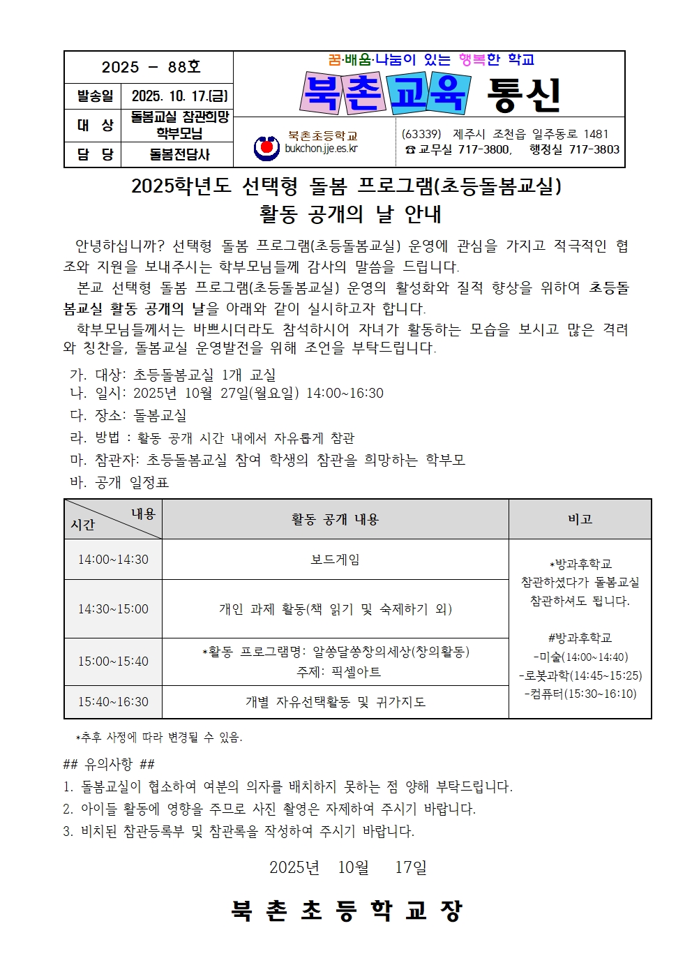 [2025 - 88호] 2025학년도 선택형 돌봄 프로그램(초등돌봄교실) 활동 공개의 날 안내