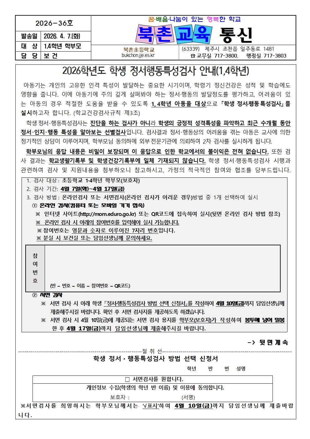 [2026-36호] 2026학년도 학생 정서행동특성검사 안내(1,4학년)