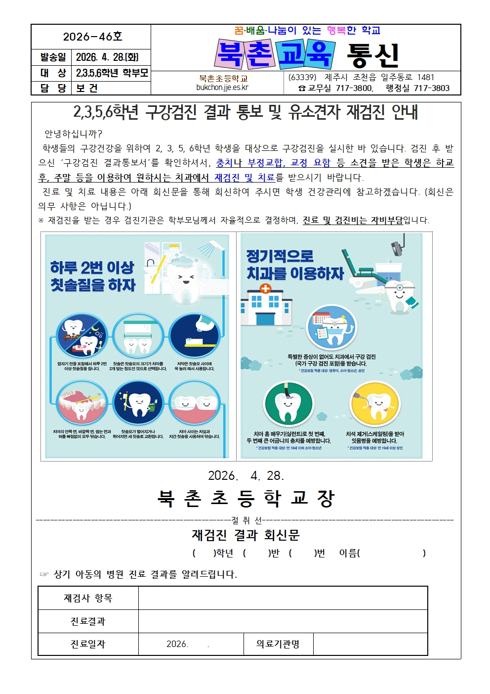 [2026-46호] 2026학년도 2,3,5,6학년 구강검진 결과통보 및 유소견자 재검진 안내