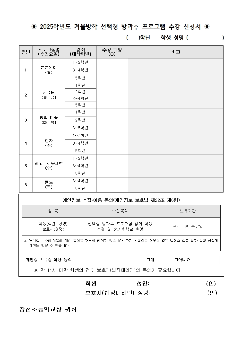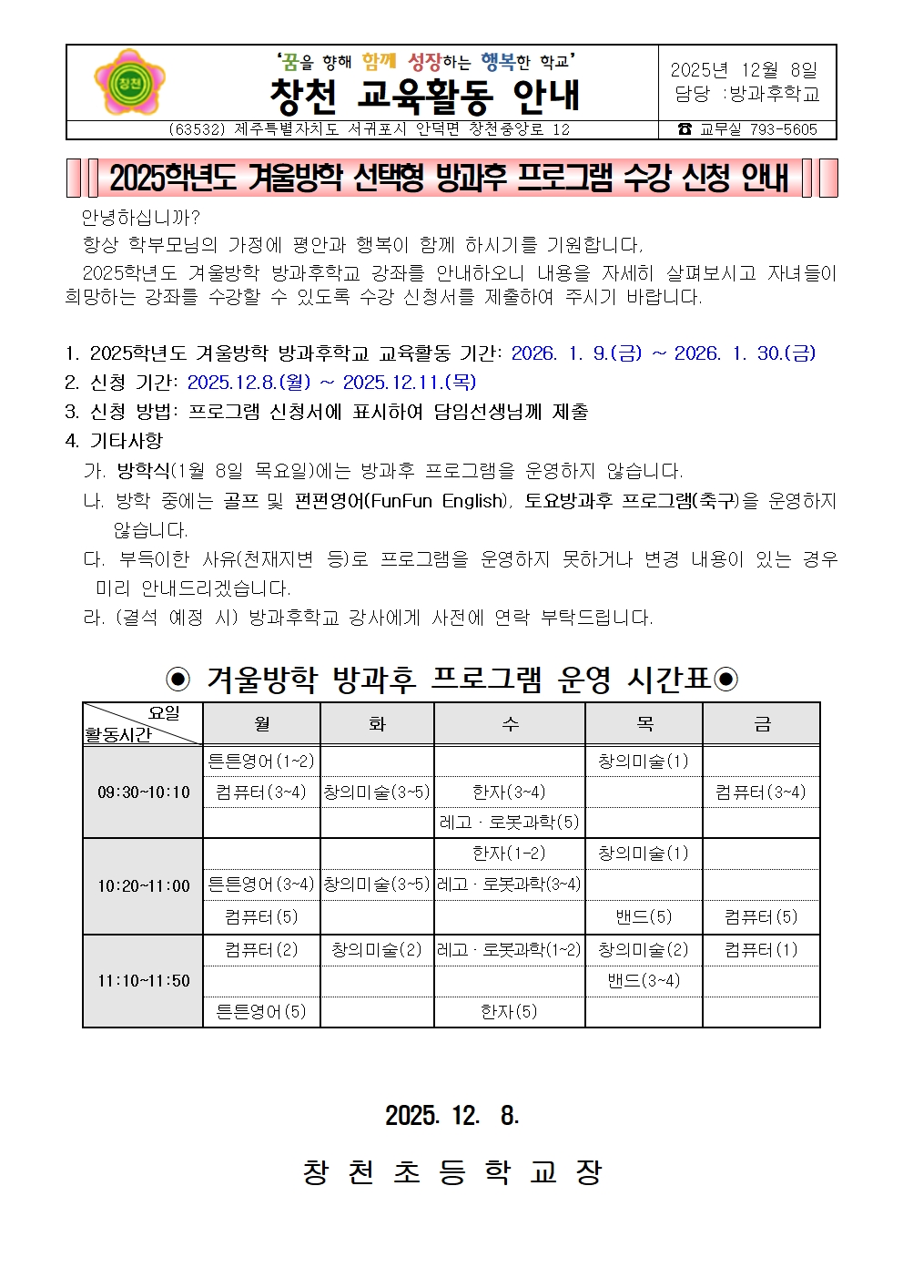 2025학년도 겨울방학 선택형 방과후 프로그램 수강신청 안내