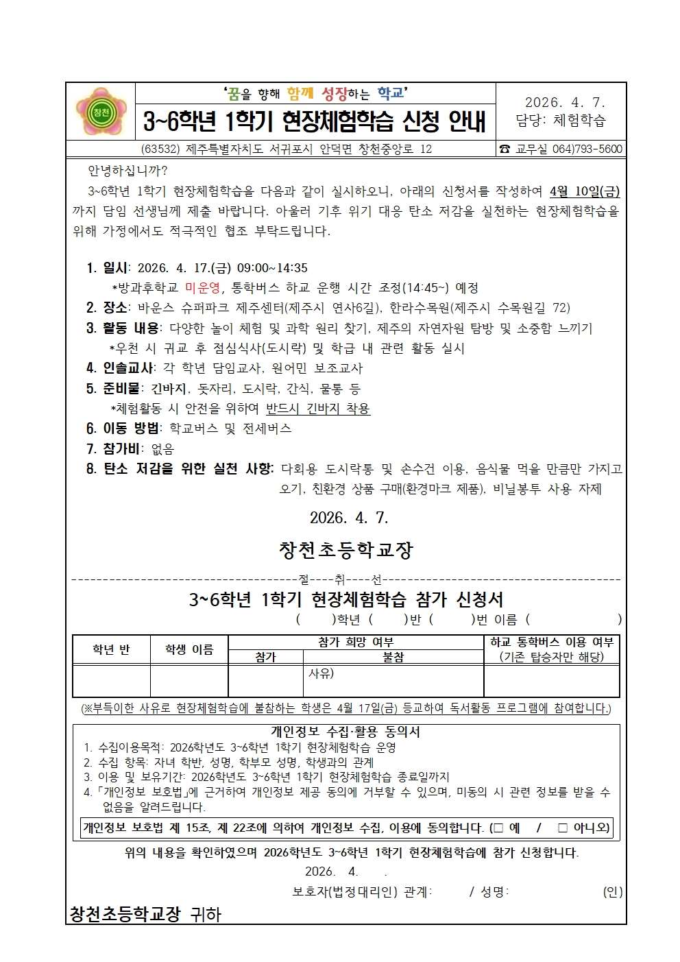 2026학년도 1학기 3~6학년 현장체험학습 가정통신문