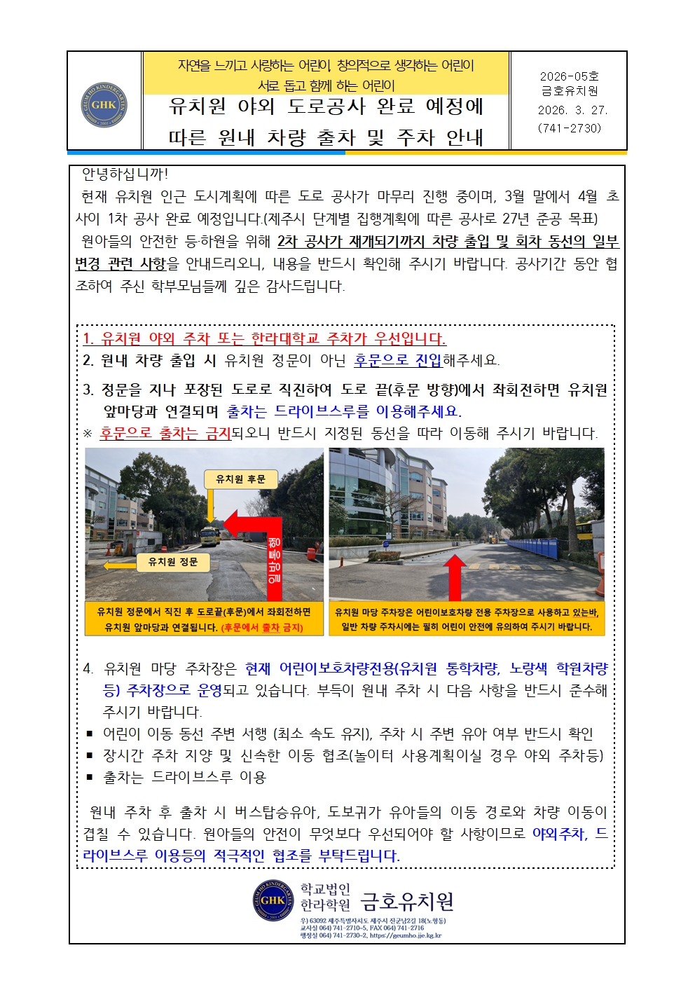 유치원 원내 차량 출차 및 주차 안내