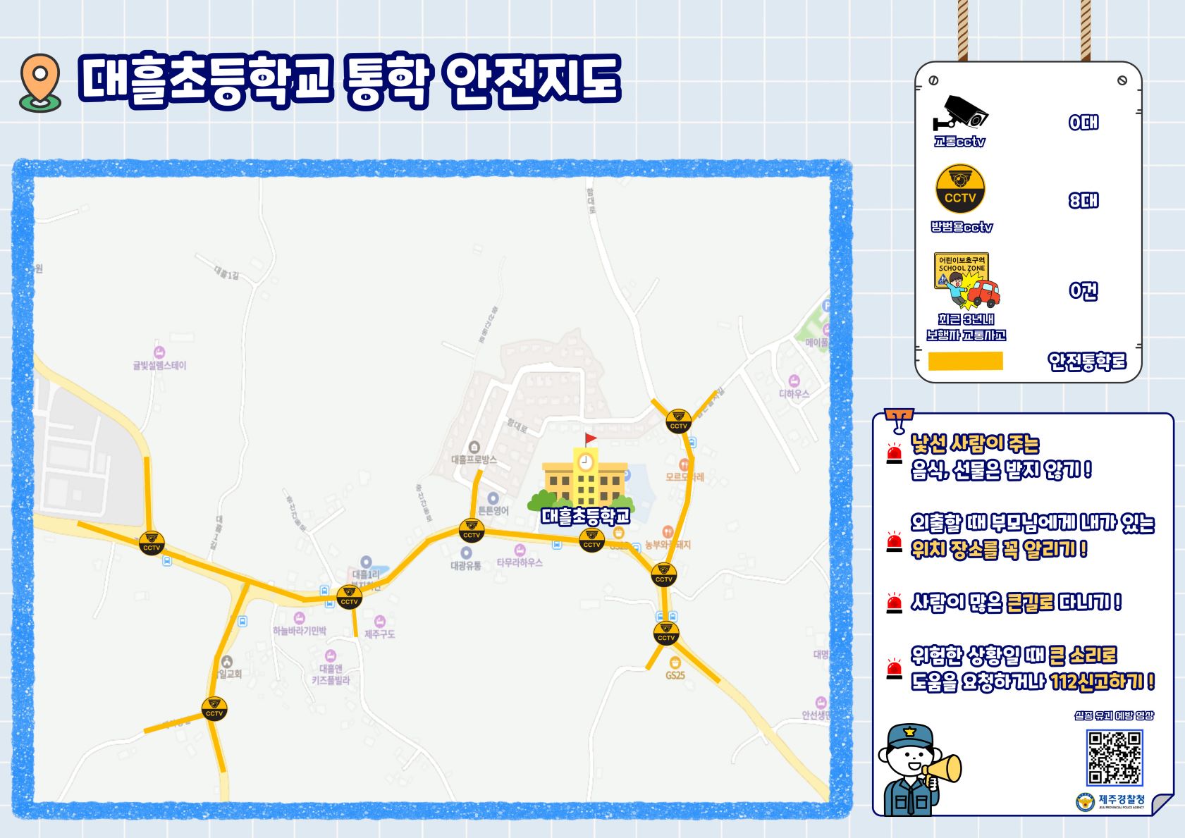 제주경찰청 기동순찰대에서 초등학교 학생들의 안전한 통학환경을 조성하고자 도내 방범용 CCTV를 활용하여 제작한 스쿨존 통학 안전 지도를 첨부해 드리오니, 학생들의 등하교 지도에 참고 부탁드립니다.
