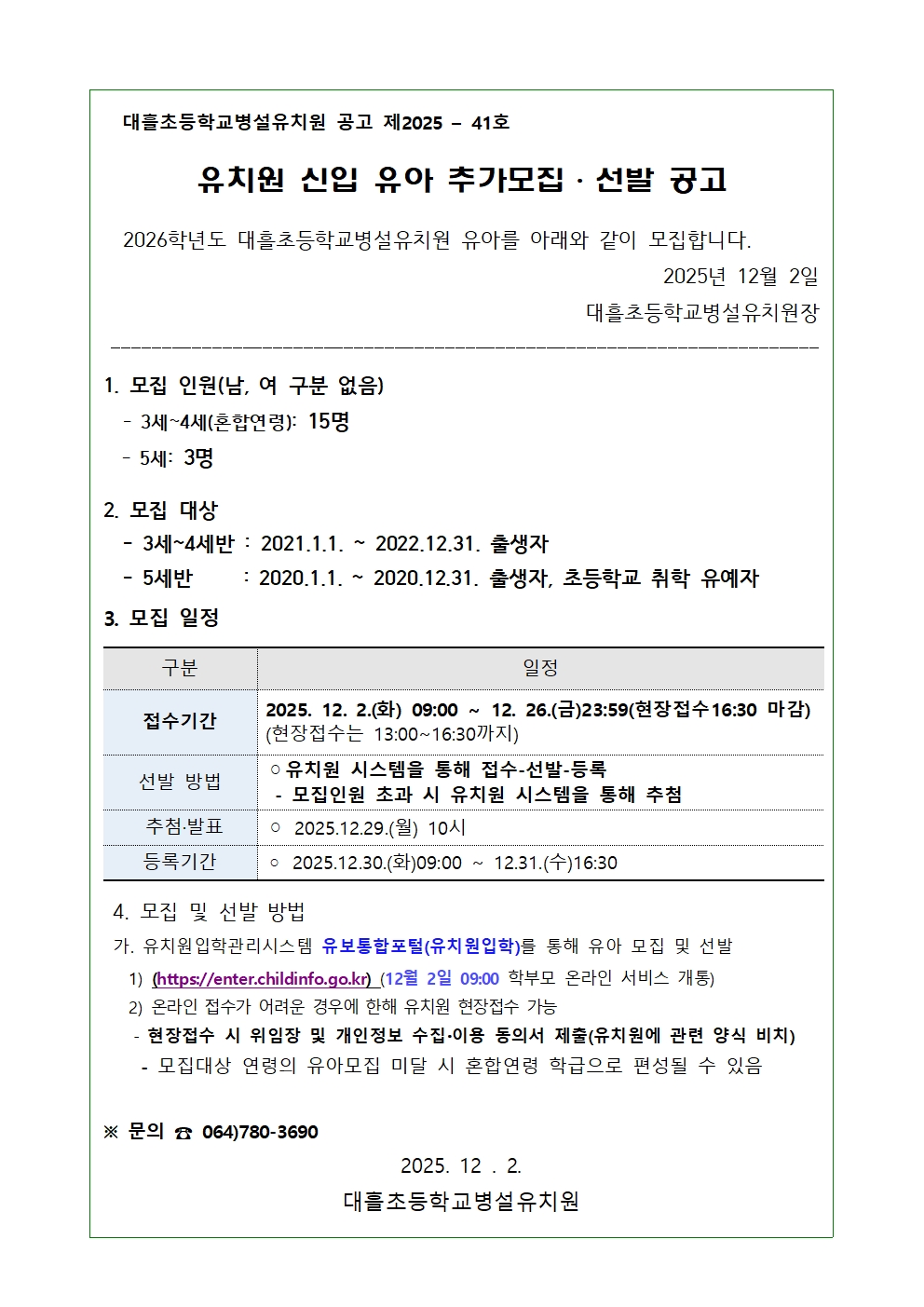 2026학년도 대흘초등학교병설유치원 신입유아 추가모집. 선발 공고