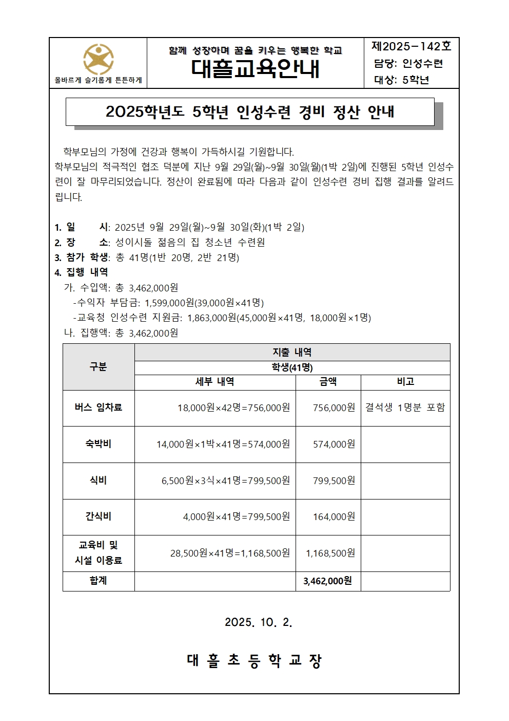 <2025-142호> 2025학년도 5학년 인성수련 경비 정산 안내