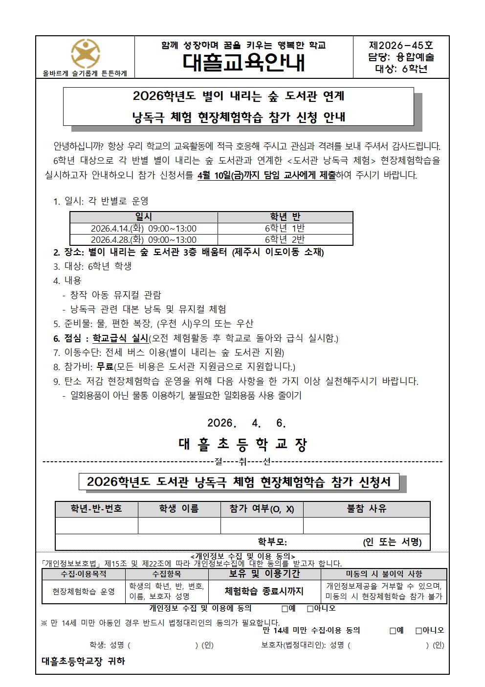 <2026-45호> 6학년 낭독극 체험 현장체험학습 참가 신청 안내