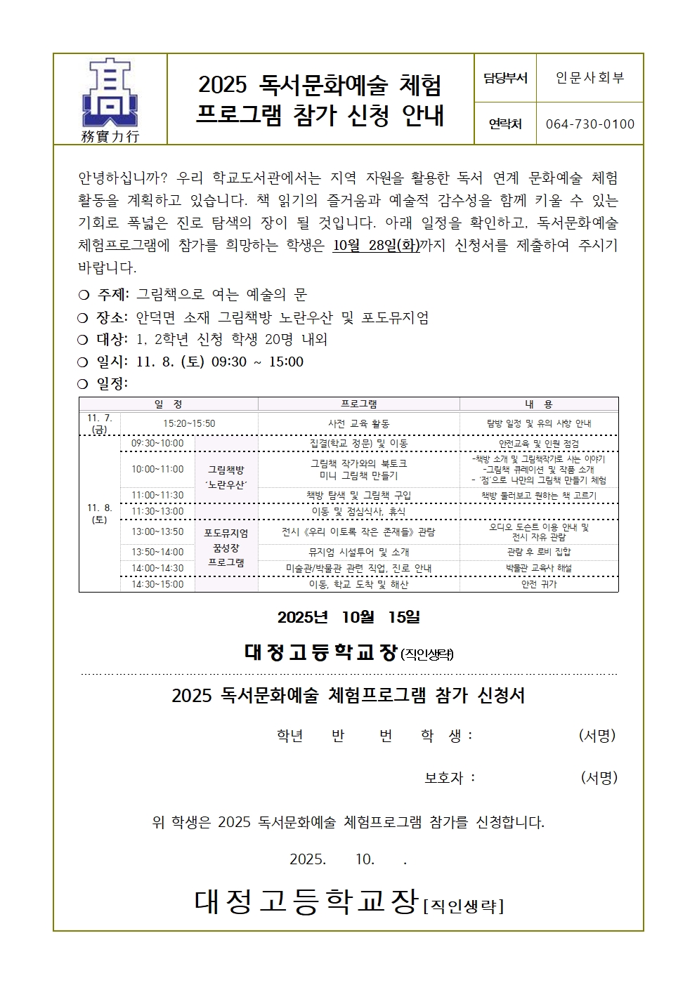 가정통신문(2025 독서문화예술 체험프로그램 참가 신청).hwpx