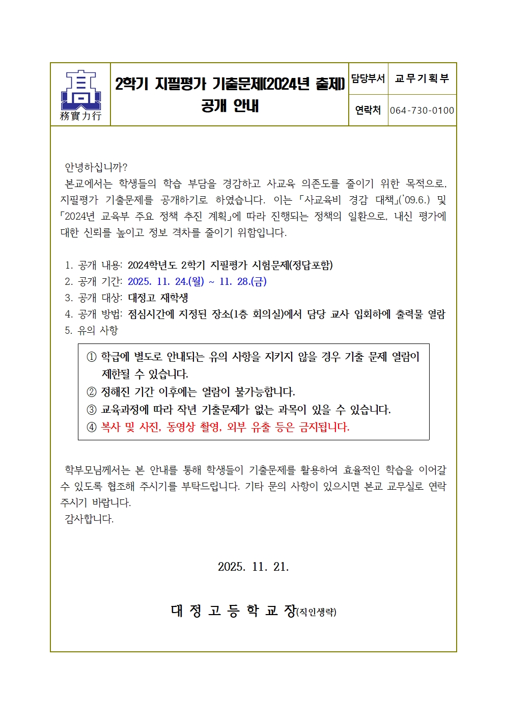 2학기 지필평가 기출문제(2024년 출제) 공개 안내