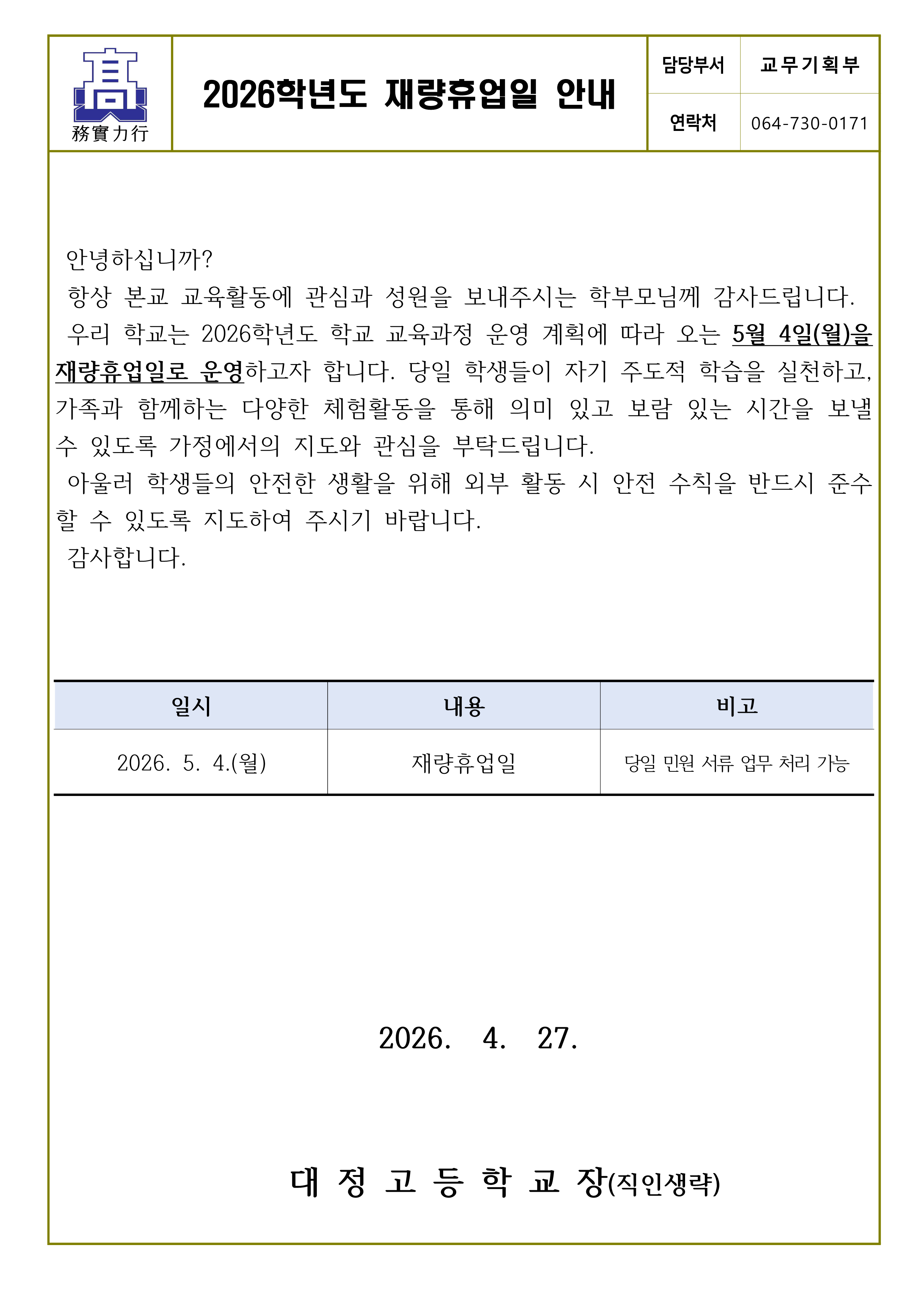 2026학년도 재량휴업일 안내