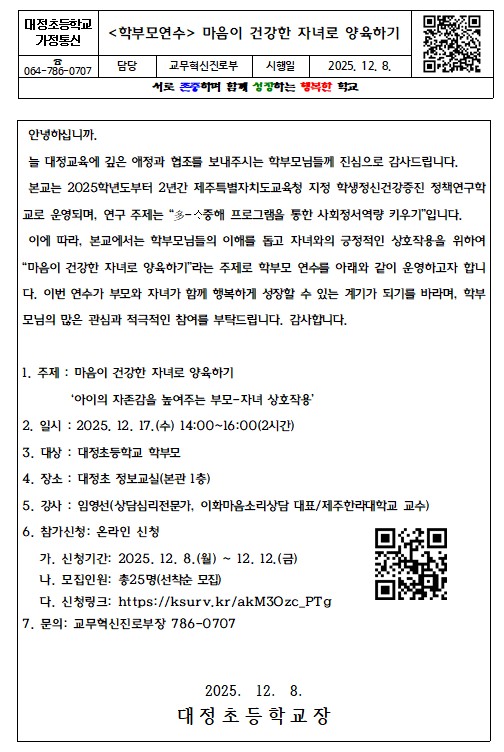 <학부모연수> 마음이 건강한 자녀로 양육하기