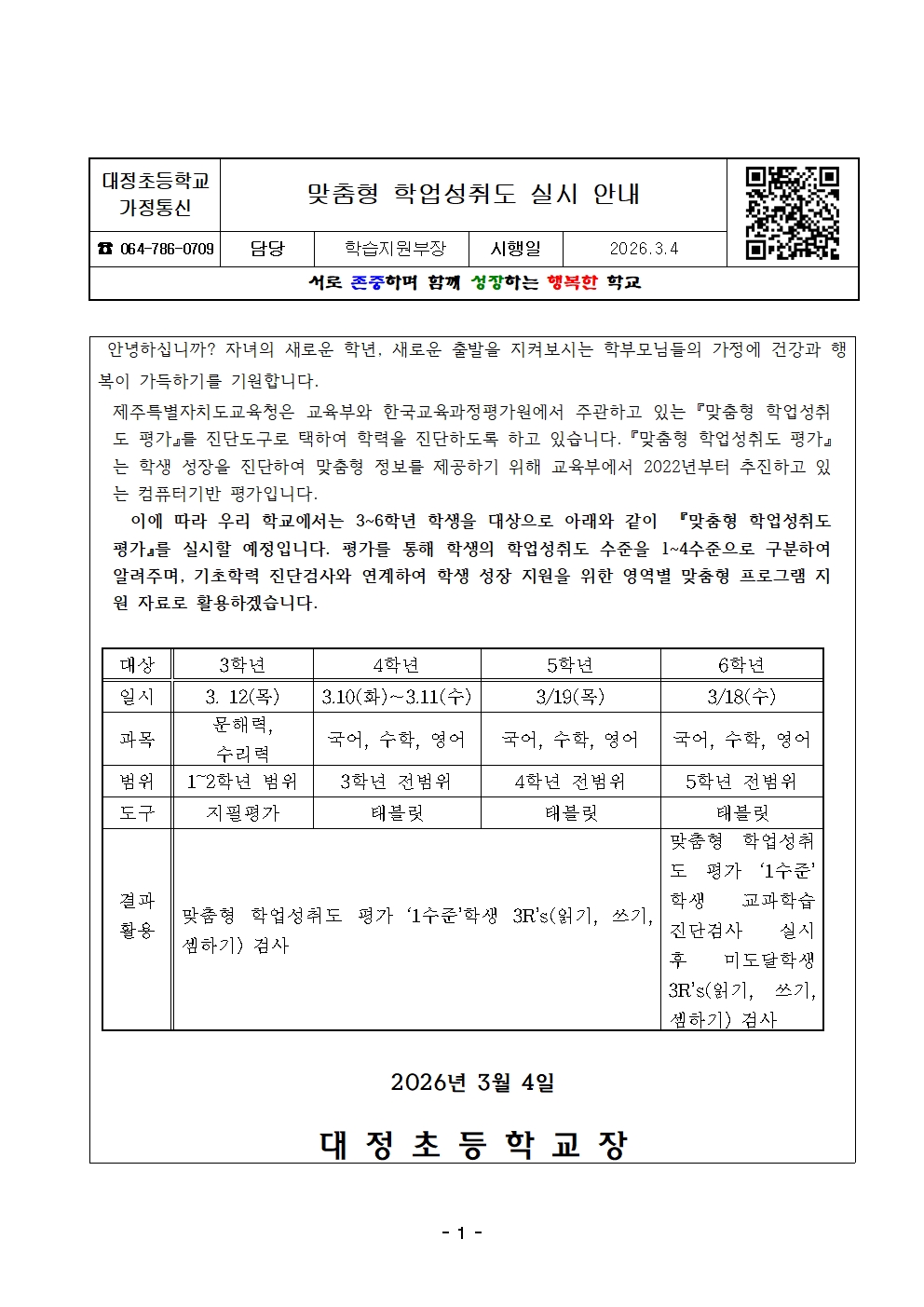 2026학년도 맞춤형 학업성취도 실시 안내