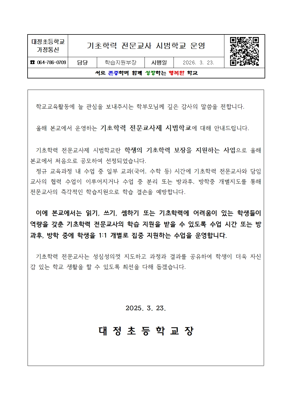 2026학년도 기초학력 전문교사 시범학교 운영 안내