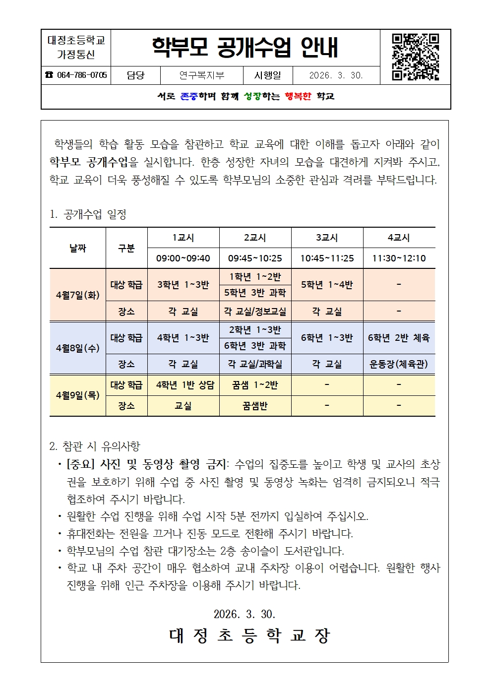학부모 공개수업 실시 안내