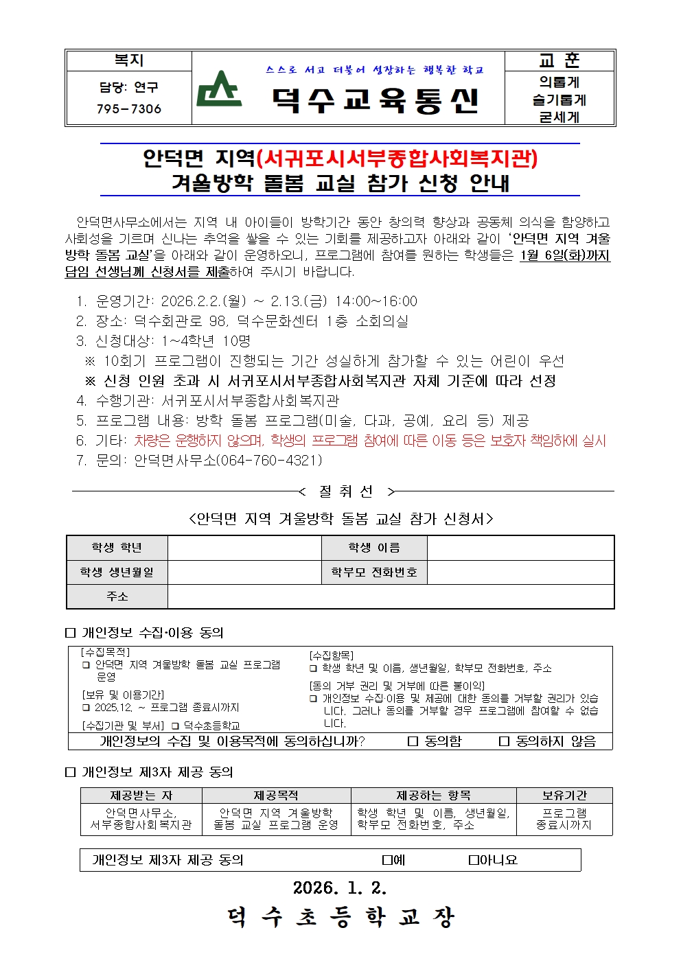 안덕면 지역(서귀포시서부종합사회복지관) 겨울방학 돌봄 교실 참가 신청 안내