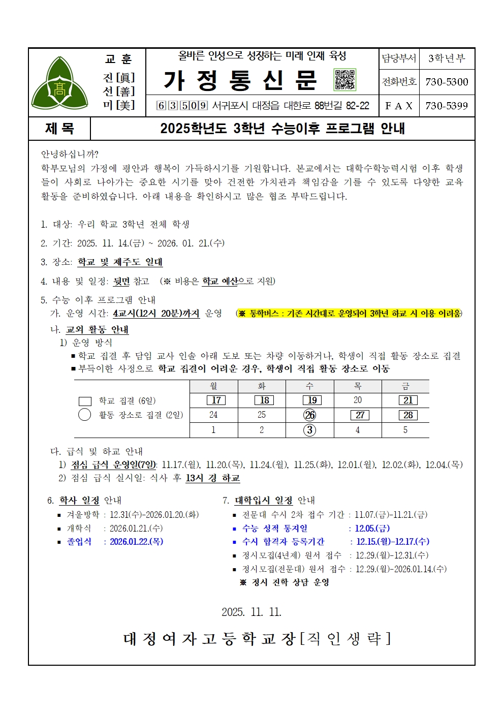 [제주특별자치도교육청 가정통신문] 2025년 학부모 대상 찾아가는 교육정책 서비스(제주특별자치도) 개최 안내