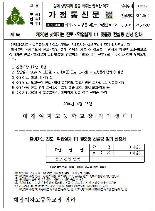 2026년 찾아가는 진로·학업설계 맞춤형 컨설팅 신청 안내(1학년)