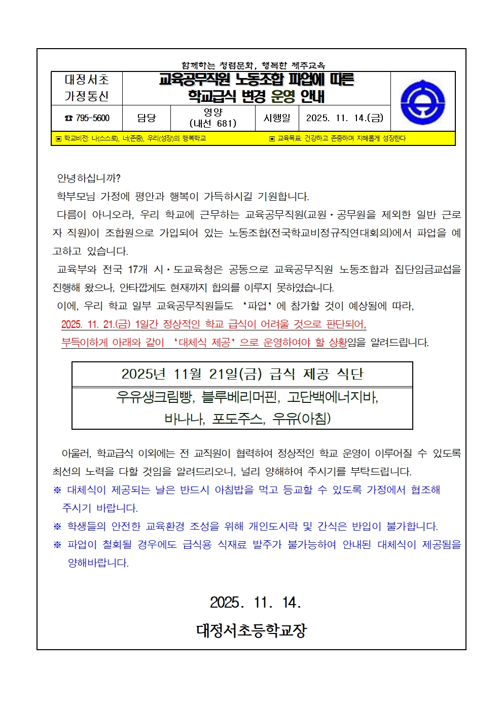 교육공무직원 노동조합 파업에 따른 학교급식 변경 운영 안내