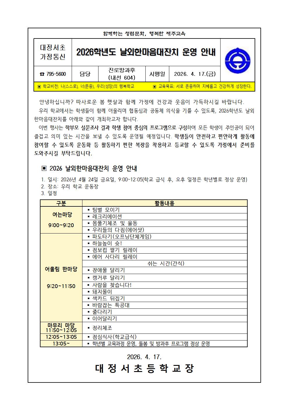 2026학년도 날외한마음대잔치 운영 안내