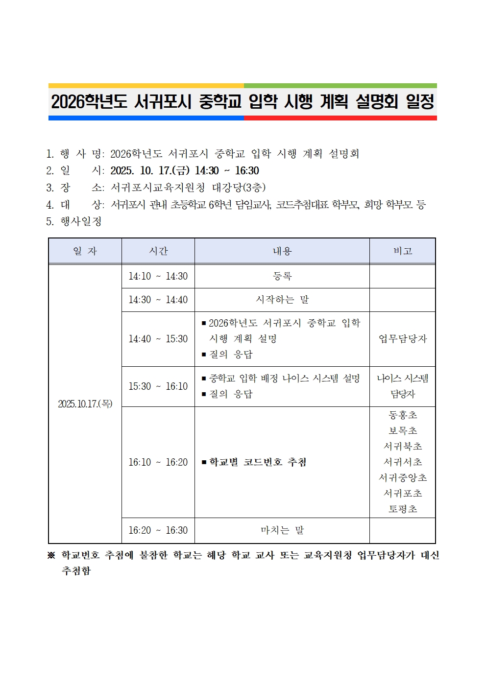 2026학년도 서귀포시 중학교 입학 시행 계획 설명회 일정(교육지원청 주관)
