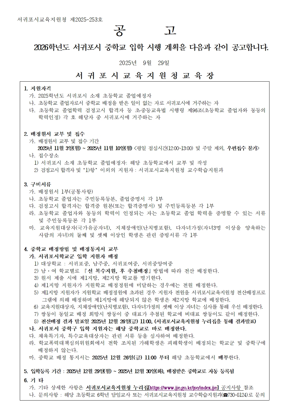 2026학년도 서귀포시 중학교 입학 시행 계획 공고문