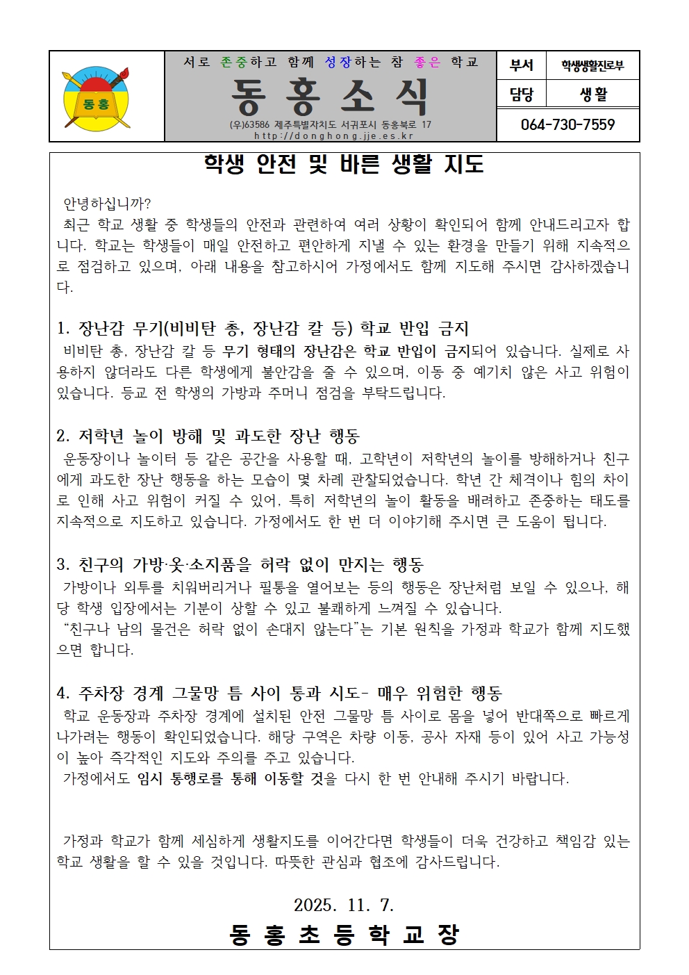 교내 학생 안전 및 바른 생활 지도 안내