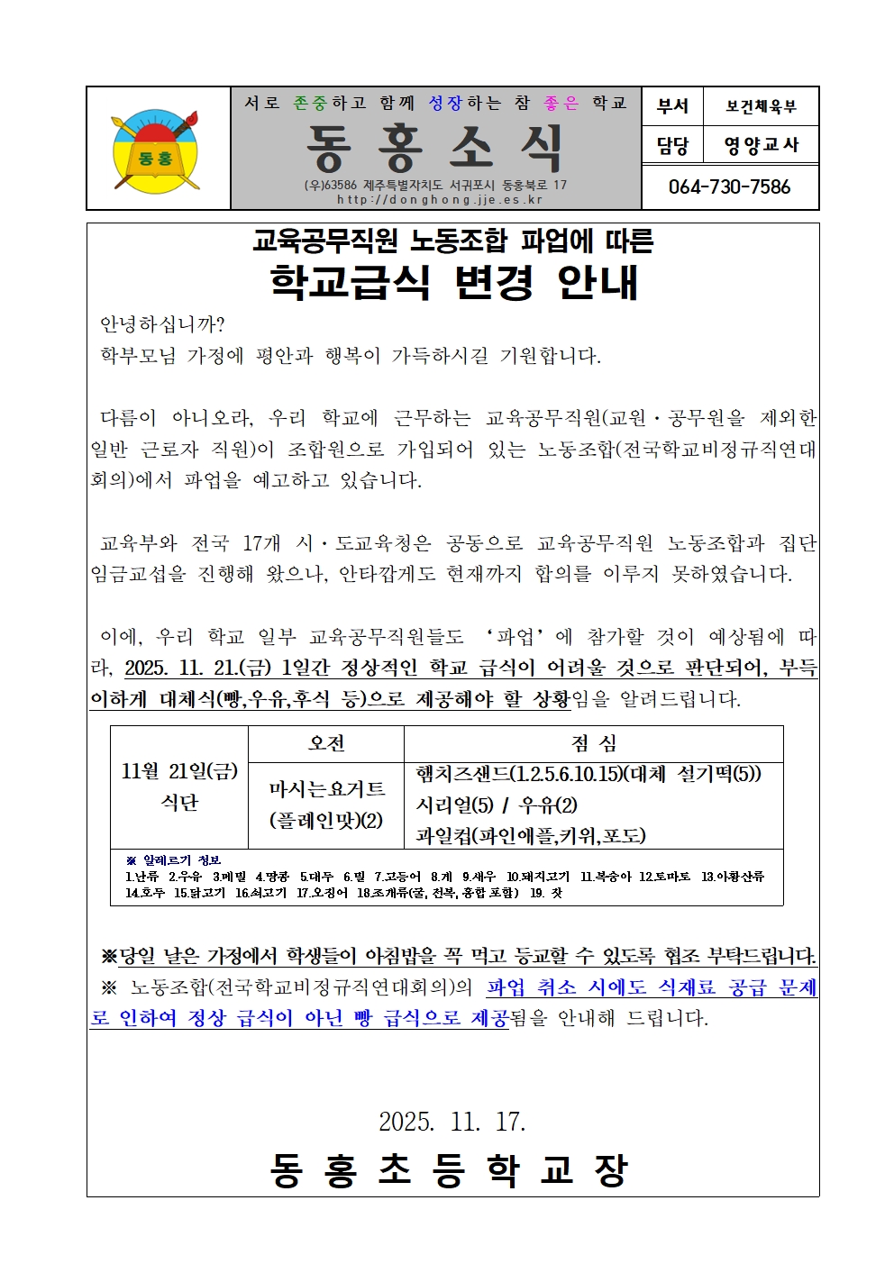 교육공무직원 노동조합 파업에 따른 학교급식 변경 안내