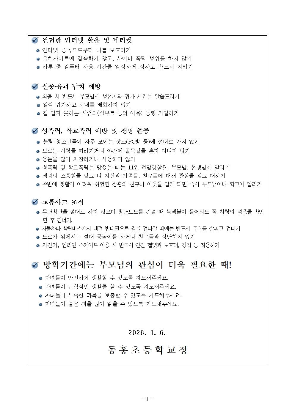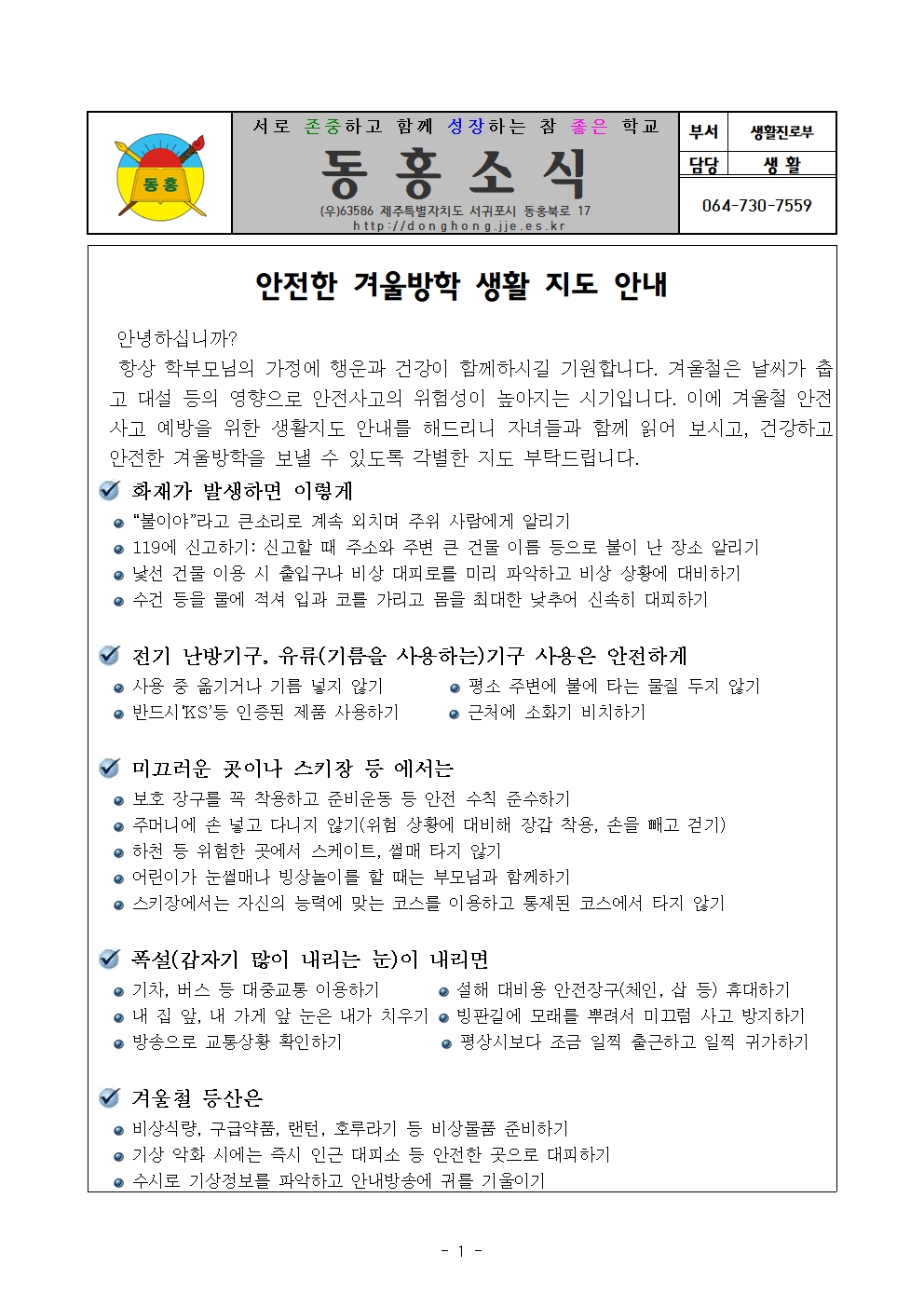 동홍초 안전한 겨울방학 생활 지도 안내