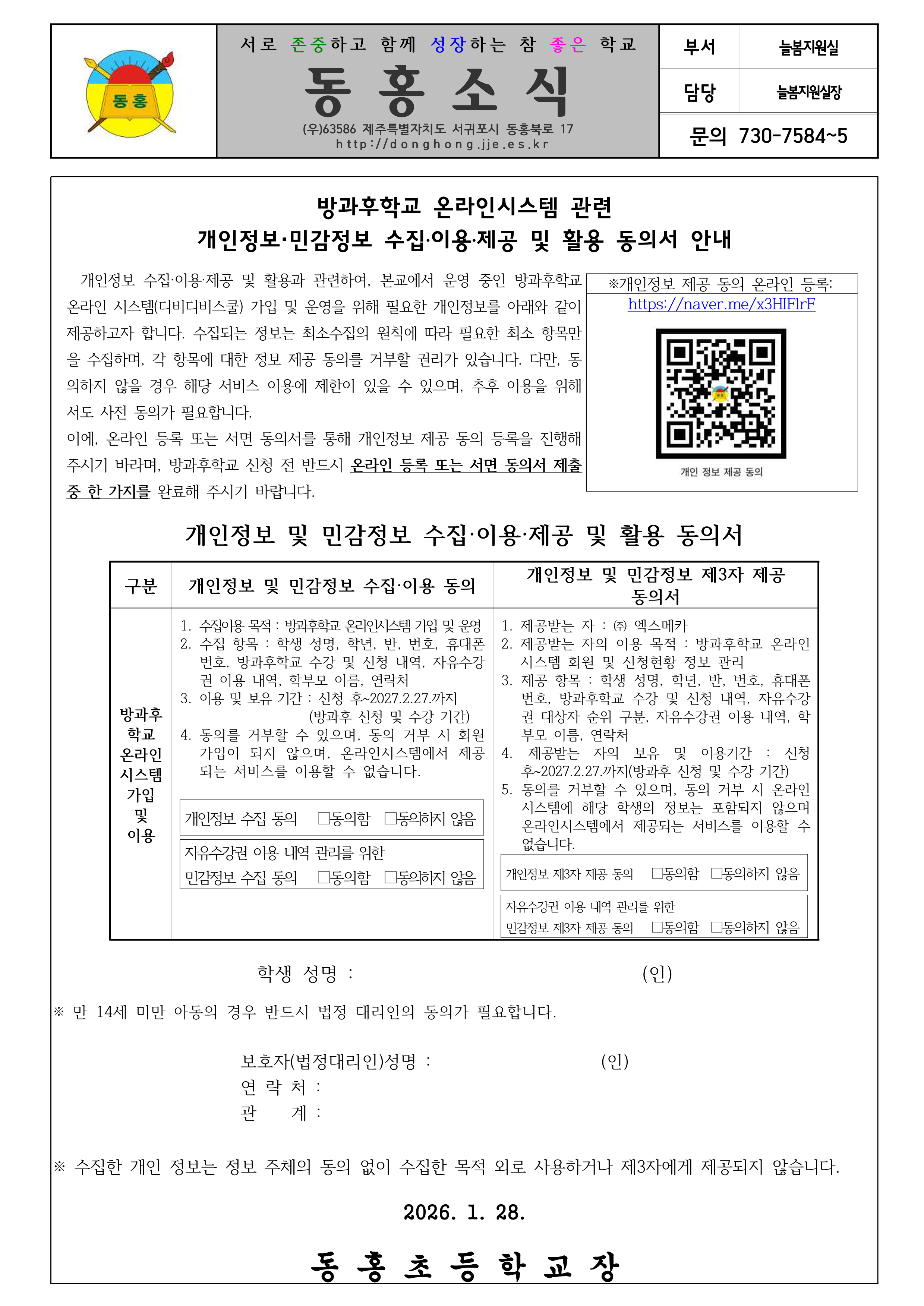 방과후학교 온라인시스템 관련 개인정보.민감정보 수입.이용.제공. 및 활용 동의서 안내