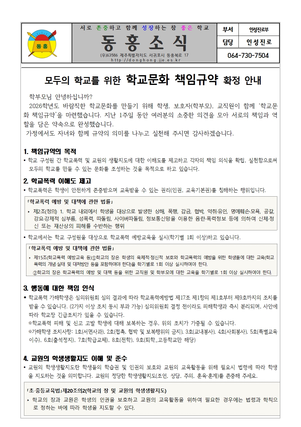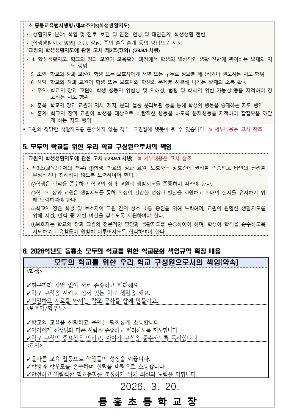 2026학년도 동홍초 모두의 학교를 위한 학교책임문화 규약 확정 안내
